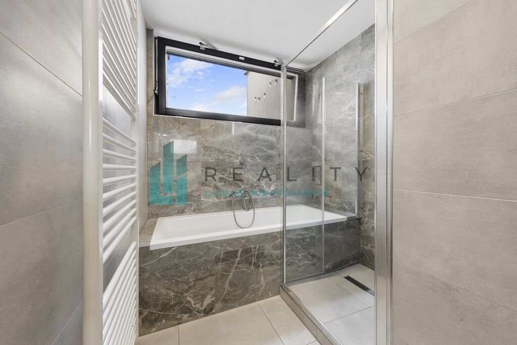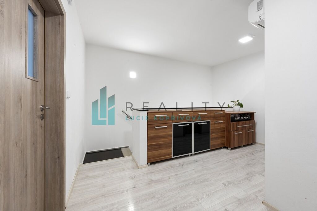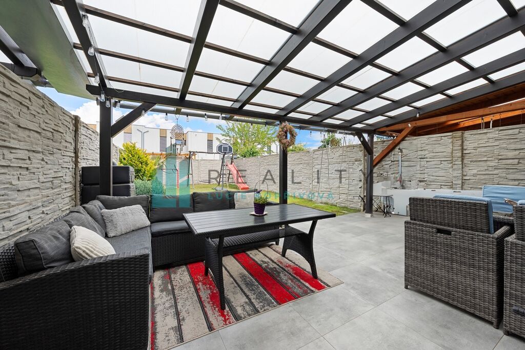 Centrem rodinného domu je prostorná obývací místnost spojena s kuchyní a jídelnou. Kuchyně byla zhotovena na míru i s účelným pracovním ostrůvkem, který pomyslně odděluje kuchyňskou část od obývací. V domě nechybí ani dva dětské pokoje, ložnice, šatna, technická místnost, dvě toalety, každá v jednom patře a velká koupelna nejen se sprchovým koutem, ale i s vanou. V patře pak najdete i dvě terasy.