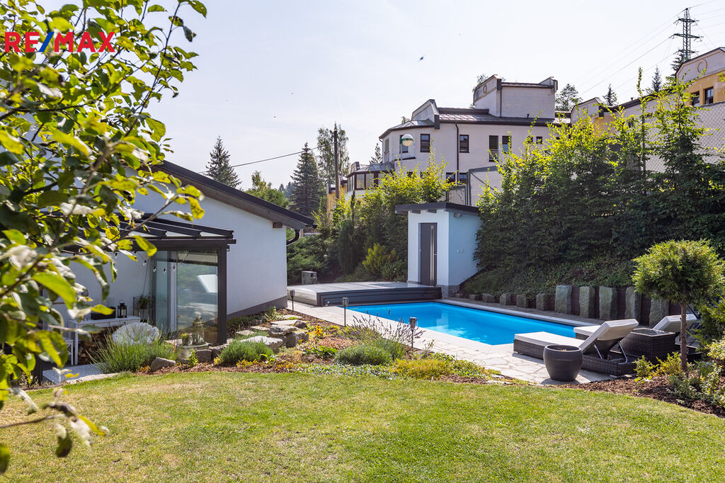 A teď to nejlepší – zahrada. Na ploše 725 m² najdete malý ráj. Pečlivě udržovaná, osázená okrasnými rostlinami a skalkami, jako stvořená pro letní večery i nedělní kávu. Velký krytý bazén nabídne osvěžení v horkých dnech, zatímco altán s letní kuchyní a kamenným krbem se stane středobodem každé oslavy. K tomu praktický zahradní domek na vše potřebné.