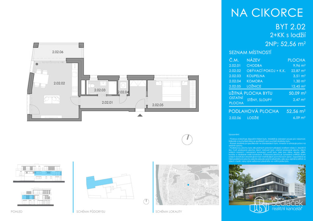 Byt o dispozici 2+kk a užitné ploše 52,56 m² se nachází ve 2. nadzemním podlaží. K bytu náleží útulná lodžie o velikosti 6,59 m², orientovaná na klidnou stranu domu.