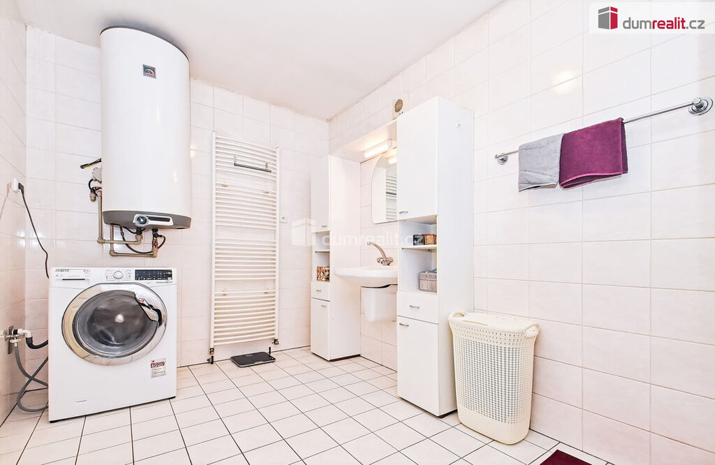 Pod domem je suchý a praktický sklep (12m²), čelní oplocení s automatickou bránou, bezproblémové parkování pro 4 auta, voda - veřejný vodovod, odpad - septik, střecha je vhodná pro FVE.