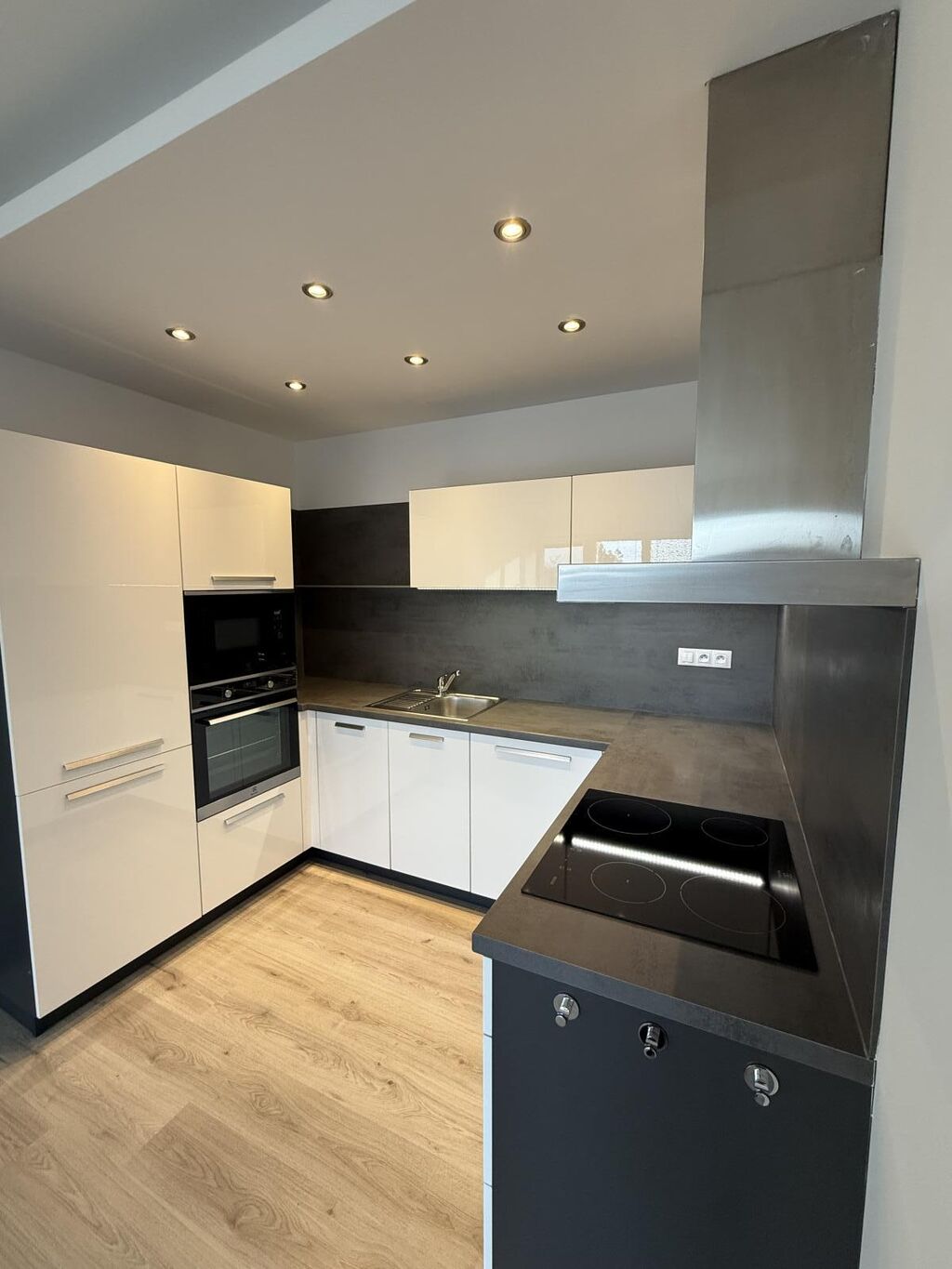 Byt je vybaven novou kuchyň.linkou s vestavěnou elektr.troubou, mikrovlnkou, sklokeramickou varnou deskou, digestoří, lednicí a myčkou.