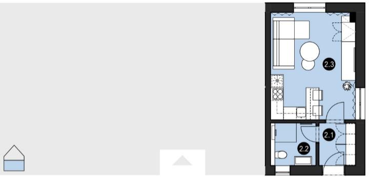 Ateliér o dispozici 1+kk a celkové ploše 26,51 m2 je umístěn v 1.NP domu a obsahuje zádveří, koupelnu s WC, místnost s kuchyňským koutem. Podlahová krytina je vinyl a keramické dlažby, vnitřní dveře v nadstandardní výšce 210 cm, vchodové dveře bezpečností, protipožární, vnitřní dveře vč. obložek v barvě dveří. V koupelně je sprchový kout, umývadlo se skříňkou, které je i na toaletě, WC je závěsné.