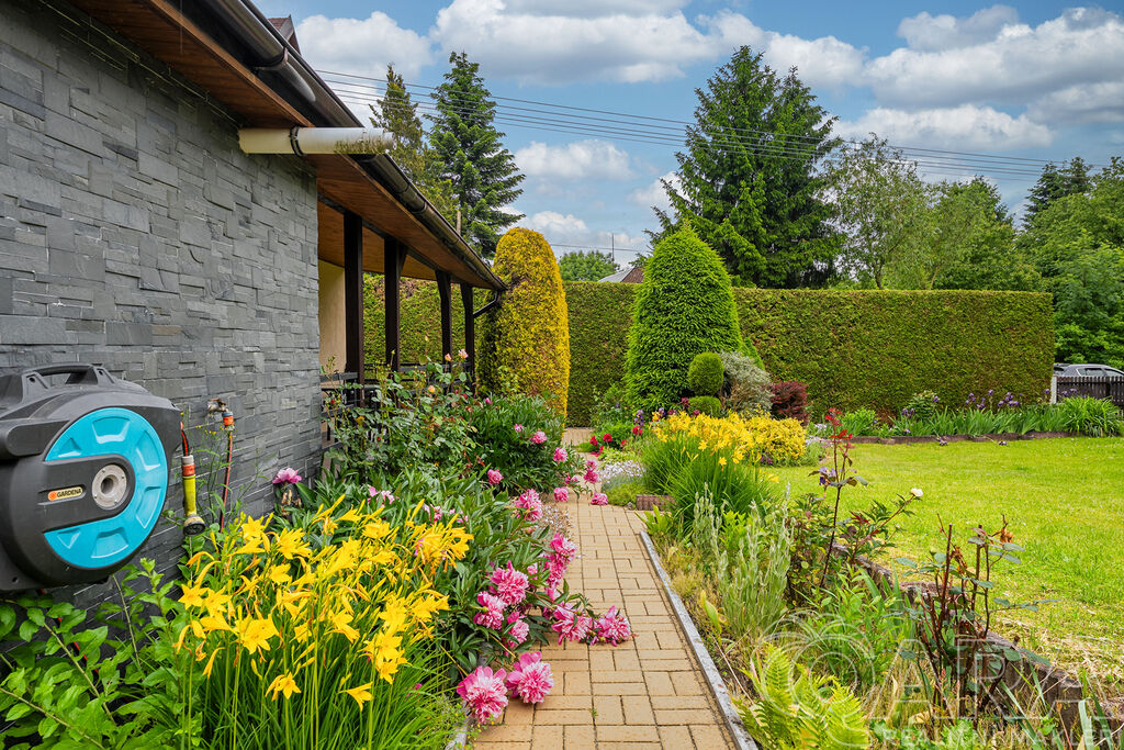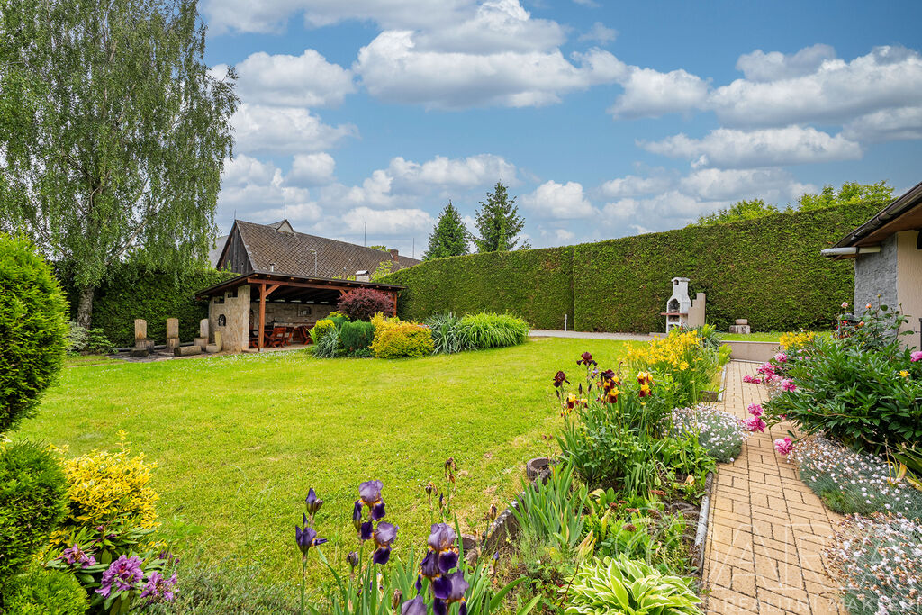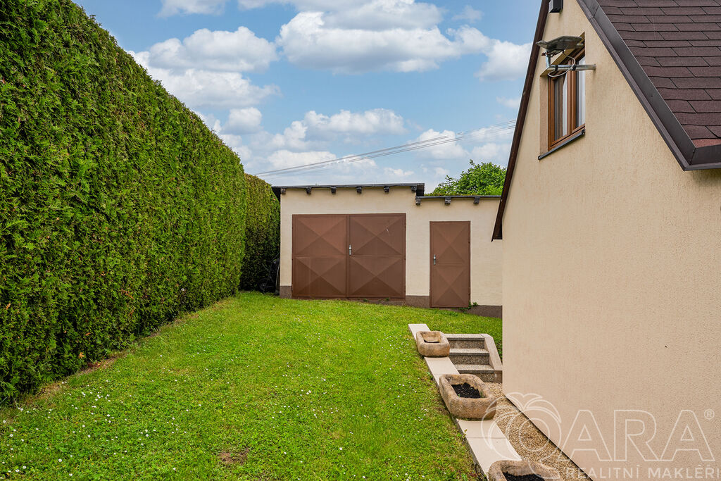 Zahrada je naprostým skvostem – okrasná, pečlivě udržovaná a díky vzrostlému živému plotu poskytuje výborné soukromí. Na pozemku se nachází garáž (aktuálně využívaná jako technický sklad a dílna), zastřešená kuchyň s posezením, udírnou, grilem a venkovním krbem. A pro horké dny? Bazén o průměru 3 metry je ideální volba.
