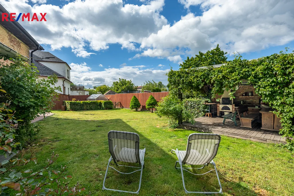 Vjezd na pozemek umožňuje elektrická brána s možností stání 2 vozů. Před domem je předzahrádka s květenou, která přináší více soukromí. Za domem je pak na jihozápad orientovaná zahrada o velikosti zhruba 200 m2, kde je mimo jiné skleník, kotec pro psy či pergola se zděným krbem, kde se můžete bavit s přáteli u dobrého jídla.
