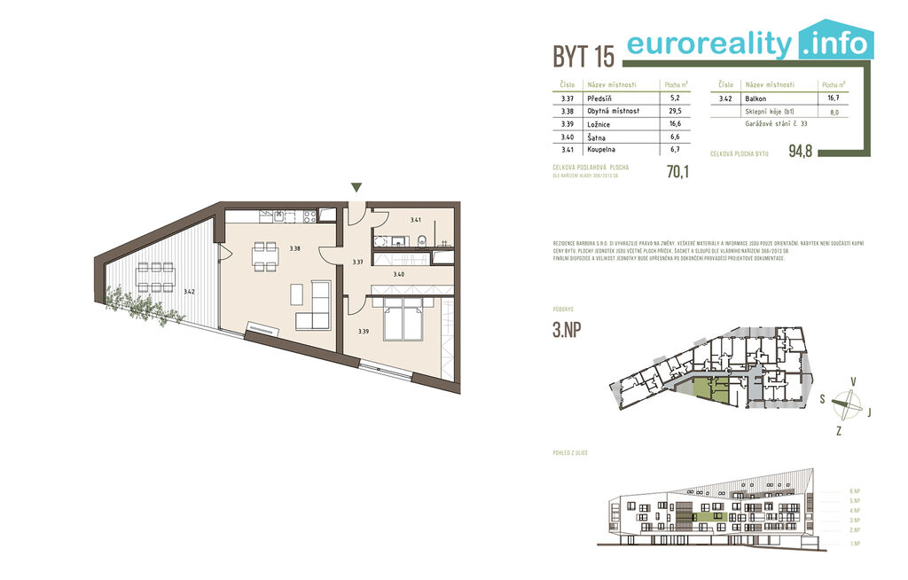 Celková užitná plocha bytu 70,1 m² a balkónu 16,7 m² zajišťuje pohodlné a prostorné bydlení. Se sklepní kójí o rozměru 8 m²