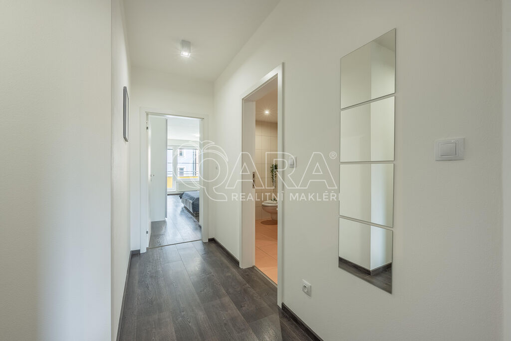 Byt o celkové výměře 136,2 m2 (vnitřní plocha 113,5 m2, balkon 7,2 m2, lodžie 12,5 m2) je výjimečně dobře dispozičně řešen a sestává ze vstupní chodby, obývacího pokoje s kuchyňským koutem, 3 ložnic, koupelny se sprchovým koutem a WC, chodby a koupelny s vanou a s WC. Z obývacího pokoje a ložnice je možný vstup na jižně orientovanou lodžii, ze dvou dalších ložnic pak je vstup na severně orientovaný balkon. V celém bytě je položena plovoucí podlaha, v předsíni a v koupelnách je dlažba. Vytápění zajišťuje centrální plynová kotelna v domě. Měsíční poplatky za byt jsou 3 995,- Kč + zálohy na elektřinu. Dům je vybaven výtahem. V suterénu domu jsou garáže vybavené kamerovým systémem, kde je možnost pronajmout si garážové stání.