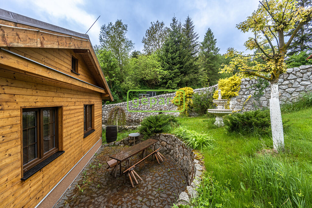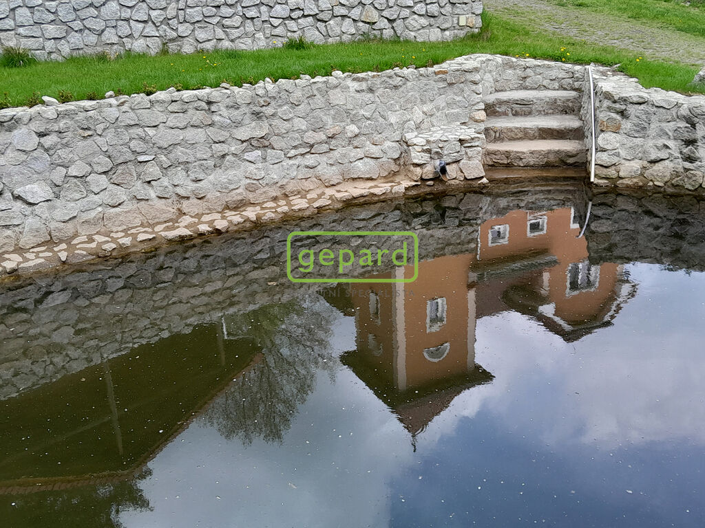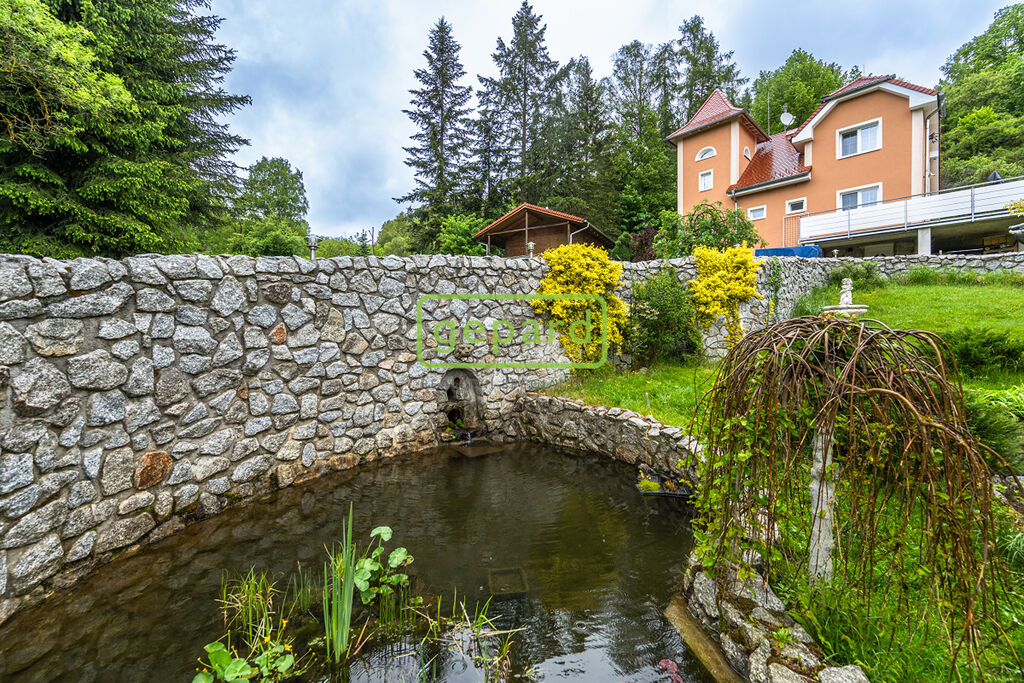 Mírně svažitý pozemek, kompletně oplocen, masivní kamenné opěrné zdi, regulovaný potok s jezírkem, koupací rybníček.