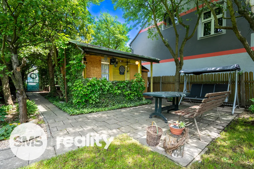 Na zahrádce rostou ovocné stromy a keře – jabloně, švestky, angrešty, maliny a rybíz – tedy ideální pro ty, kdo si chtějí užít i něco z vlastní úrody.