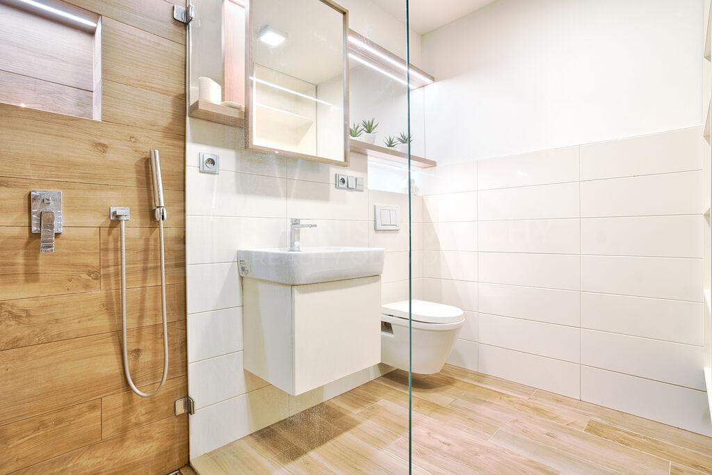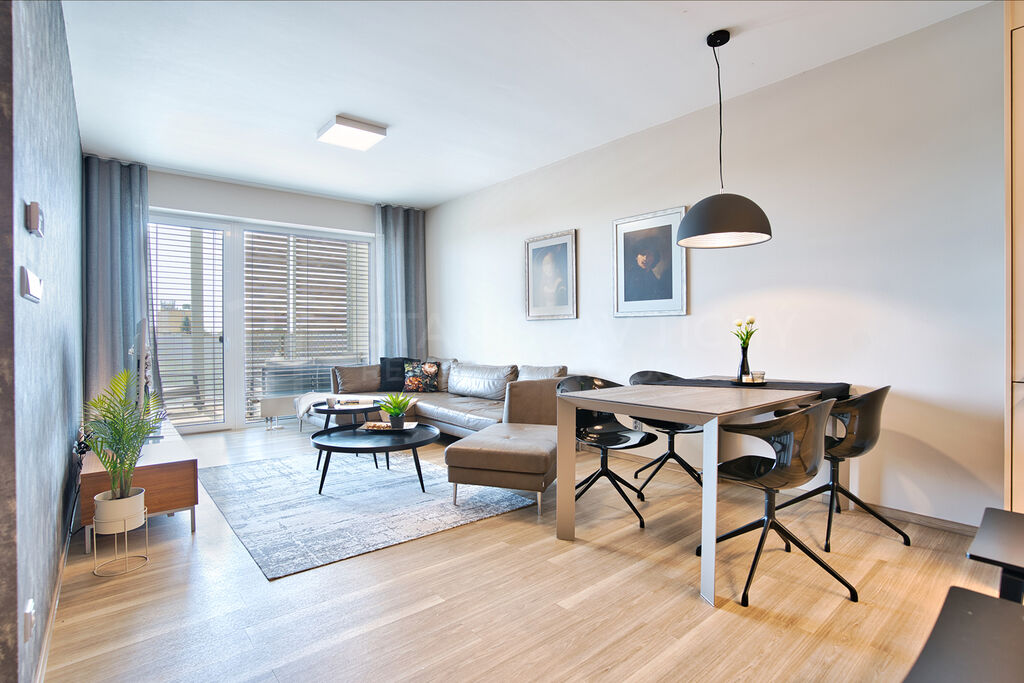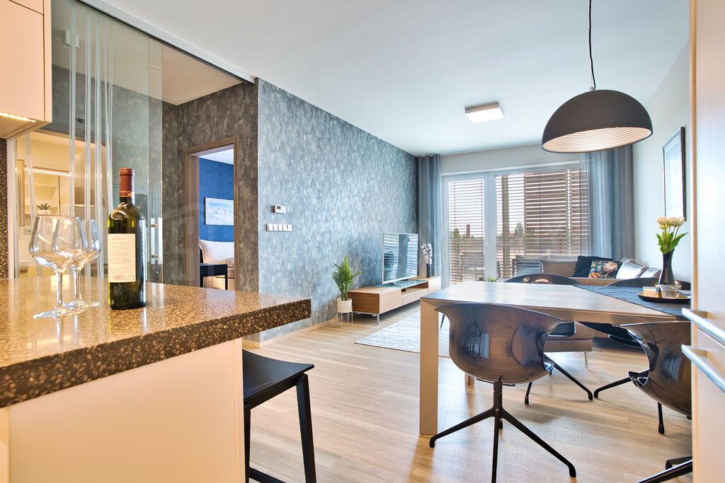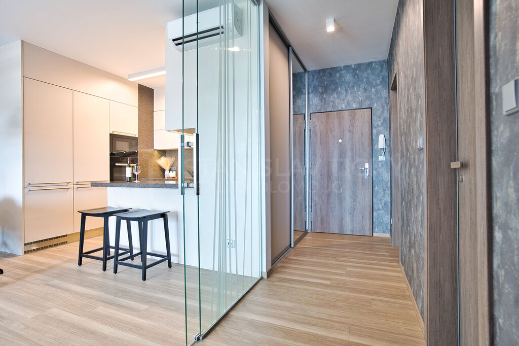 Díky velkým proskleným plochám je byt pěkně krásně prosvětlený a vzdušný. Pocit otevřenosti a elegance umocňuje i prosklená posuvná stěna, stylově oddělující jednotlivé zóny obytného prostoru. Byt je vybaven řízeným větráním s rekuperací, které udržuje příjemné a zdravé vnitřní klima a šetří náklady na vytápění. Klimatizace pak udržuje optimální teplotu během letních měsíců, takže komfort bydlení je zajištěný po celý rok. Útulná ložnice nabízí nejen útočiště pro odpočinek a relaxaci, ale i místo pro stylový psací stůl. Koupelna je zařízena v moderním stylu s kvalitními materiály, designovými prvky a ambientním osvětlením. Celkový komfort a soukromí zvyšují i elektricky ovládané venkovní žaluzie, poskytující ochranu před slunečními paprsky a možnost regulace přirozeného osvětlení interiéru.