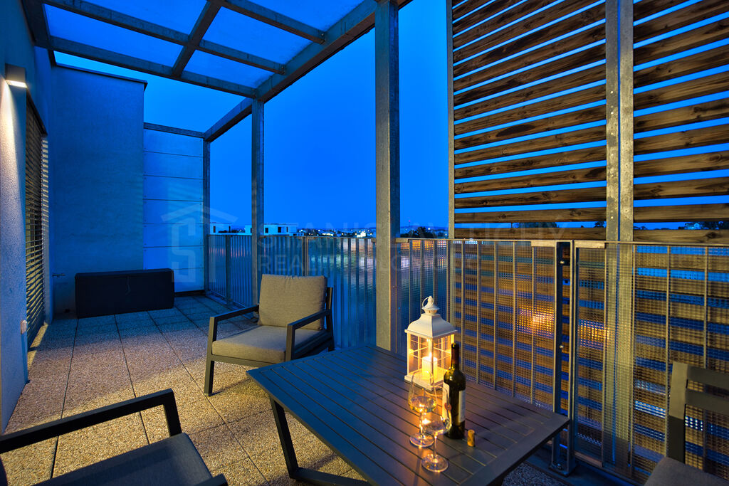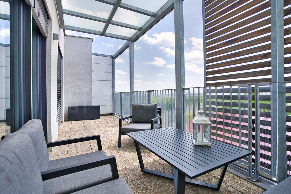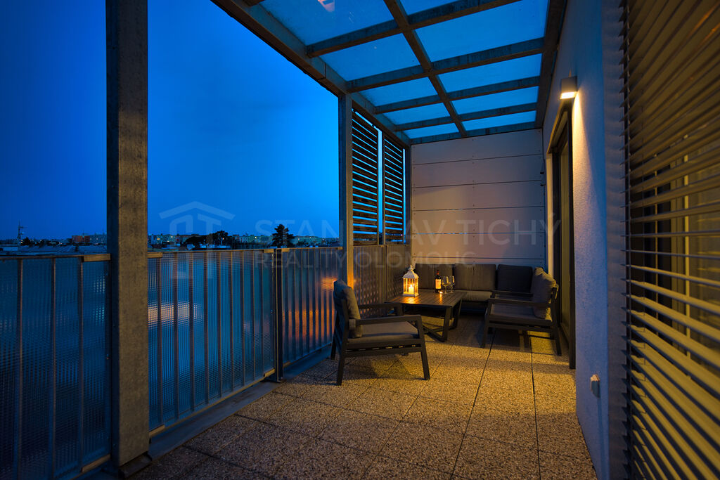 Jednou z největších předností této nemovitosti je částečně krytá střešní terasa, která nabízí dech beroucí výhled na město i když na ni odnikud není vidět. Poskytuje tak venkovní prostor s naprostým soukromím, ideální pro relaxaci nebo příjemné posezení s rodinou a přáteli.