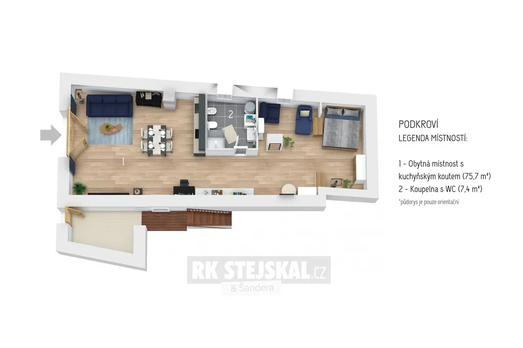 Aktuálně je objekt rozdělen do tří samostatných částí – původní obytná jednotka, menší dvoupokojový apartmán a prostorný apartmán v podkroví. Tato dispozice umožňuje dům využívat jak pro trvalé bydlení, tak i pro rekreační účely s možností sezonního pronájmu. K dispozici je také rozlehlá půda s potenciálem pro další rozšíření obytné plochy.