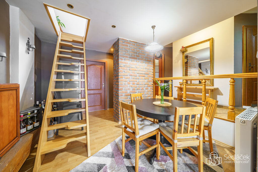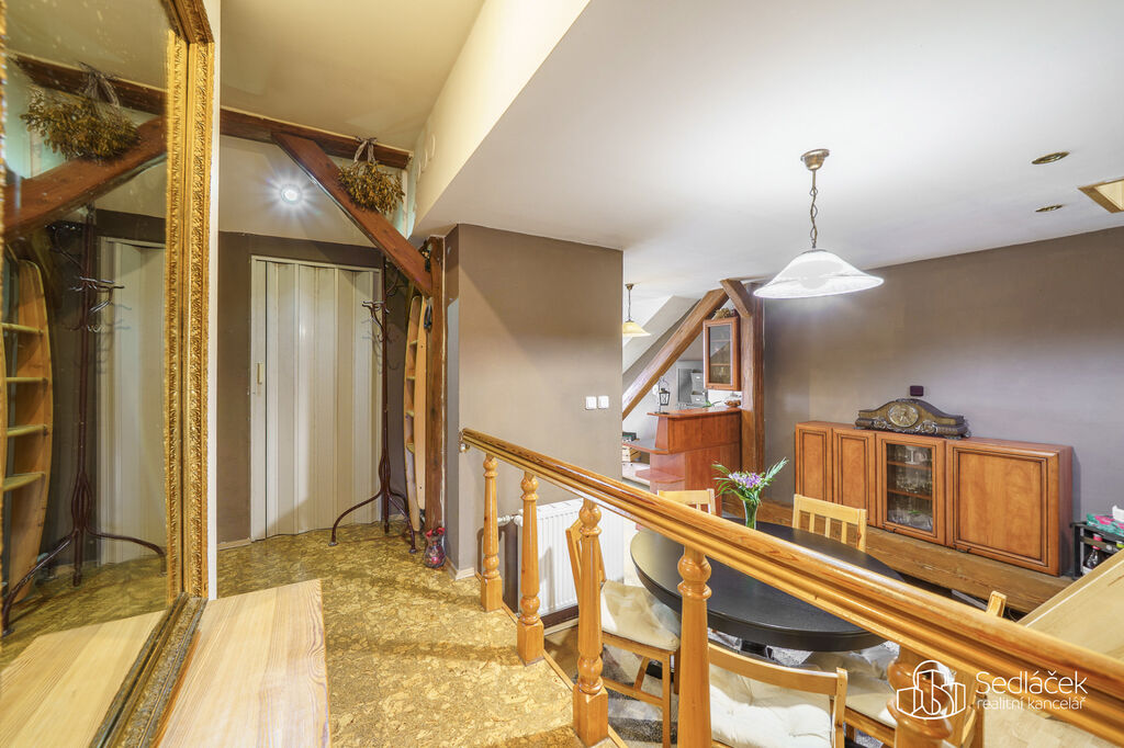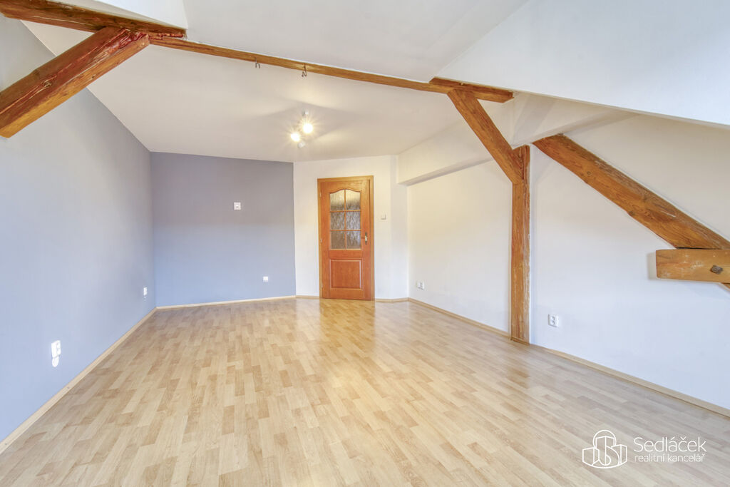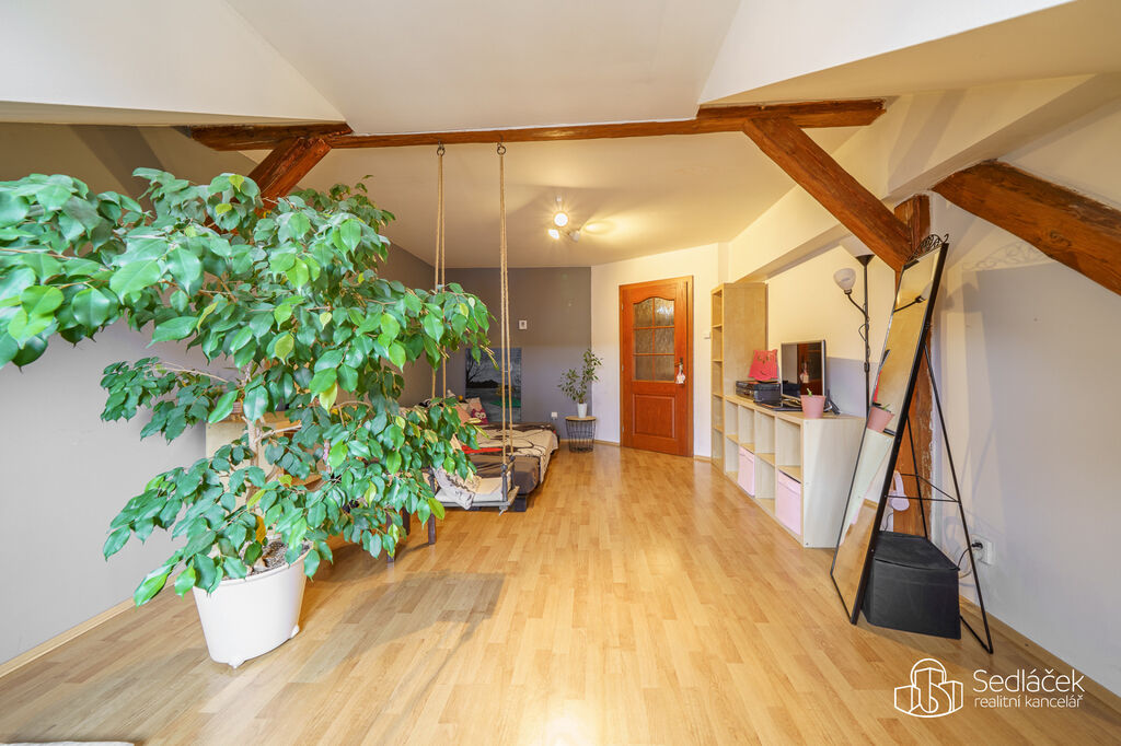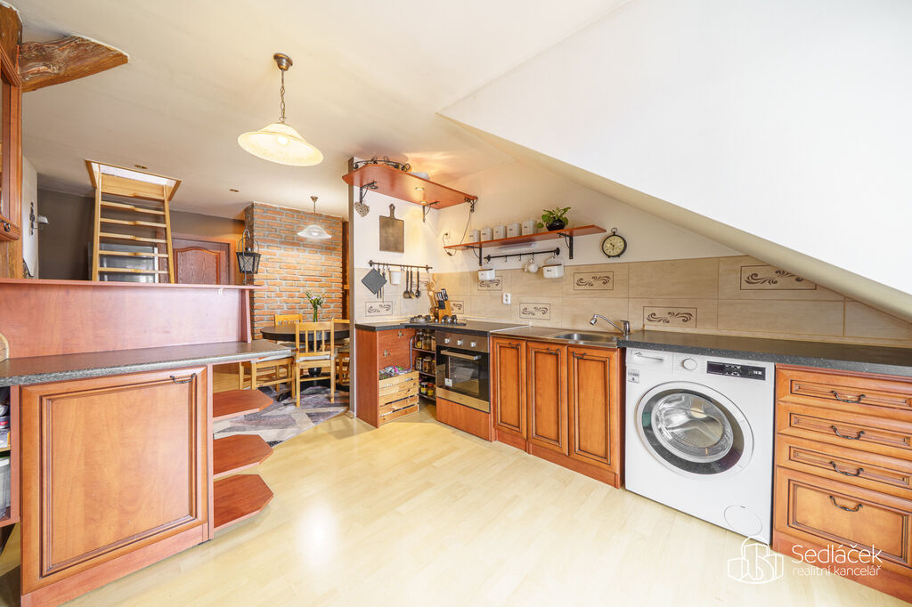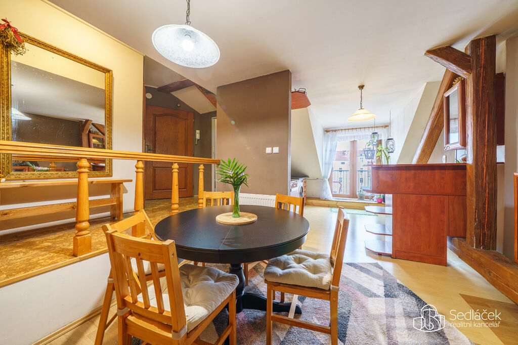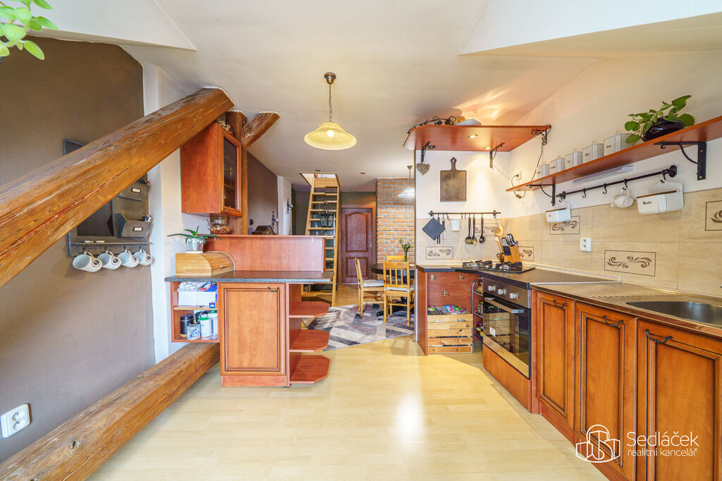 Byt se nachází ve velmi dobrém stavu a zaujme členitým dispozičním řešením. V hlavní obytné části se nachází prostorná kuchyně s jídelním koutem, odkud je vstup na terasou s výhledem na město. Dřevěné trámy dodávají interiéru příjemnou atmosféru. Koupelna nabízí vanu i sprchový kout, vytápění zajišťuje nový kondenzační plynový kotel. Dále jsou zde dva samostatné pokoje a komora.