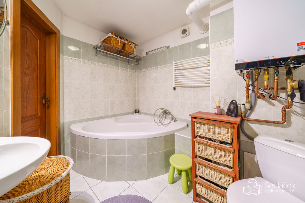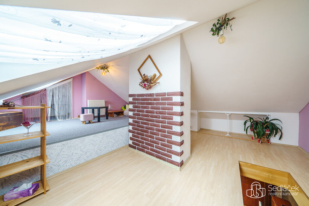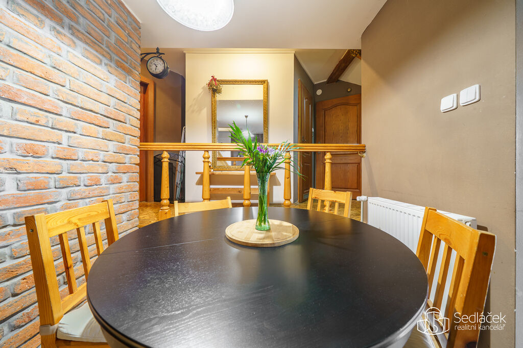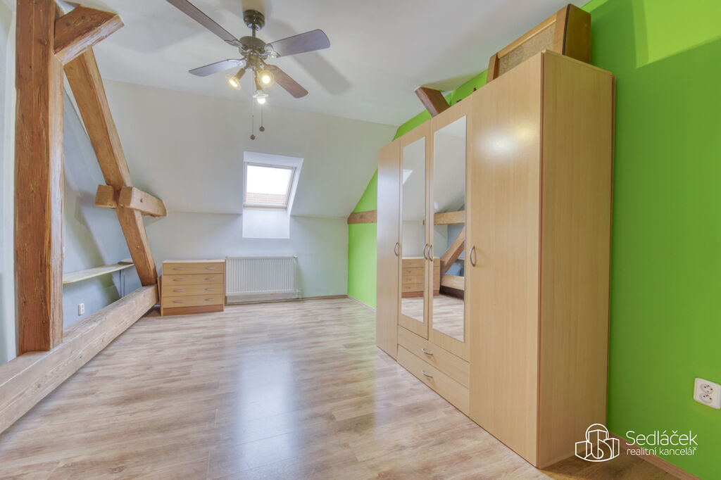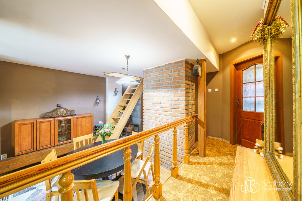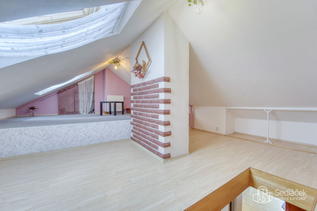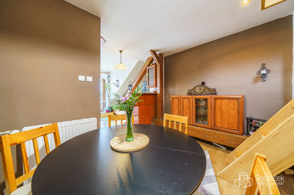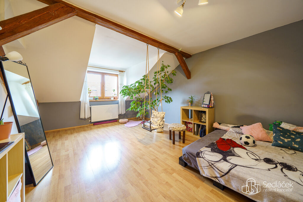 Byt se nachází ve velmi dobrém stavu a zaujme členitým dispozičním řešením. V hlavní obytné části se nachází prostorná kuchyně s jídelním koutem, odkud je vstup na terasou s výhledem na město. Dřevěné trámy dodávají interiéru příjemnou atmosféru. Koupelna nabízí vanu i sprchový kout, vytápění zajišťuje nový kondenzační plynový kotel. Dále jsou zde dva samostatné pokoje a komora.