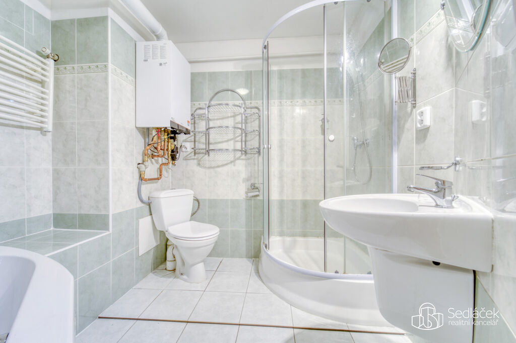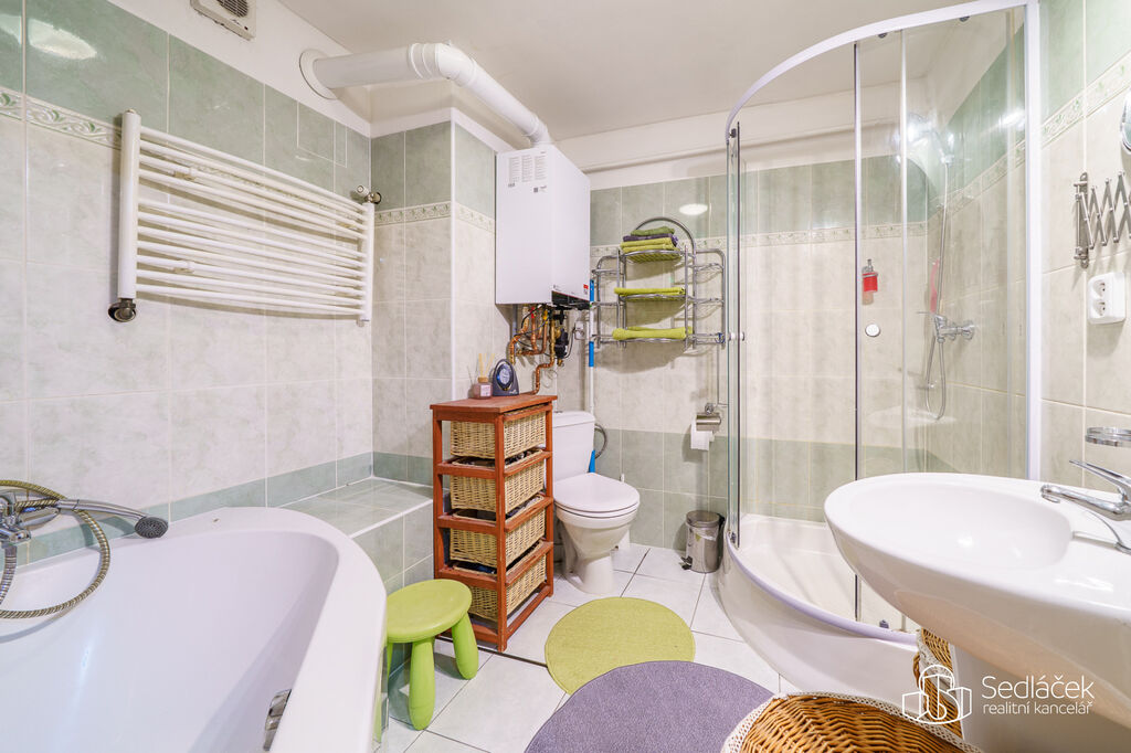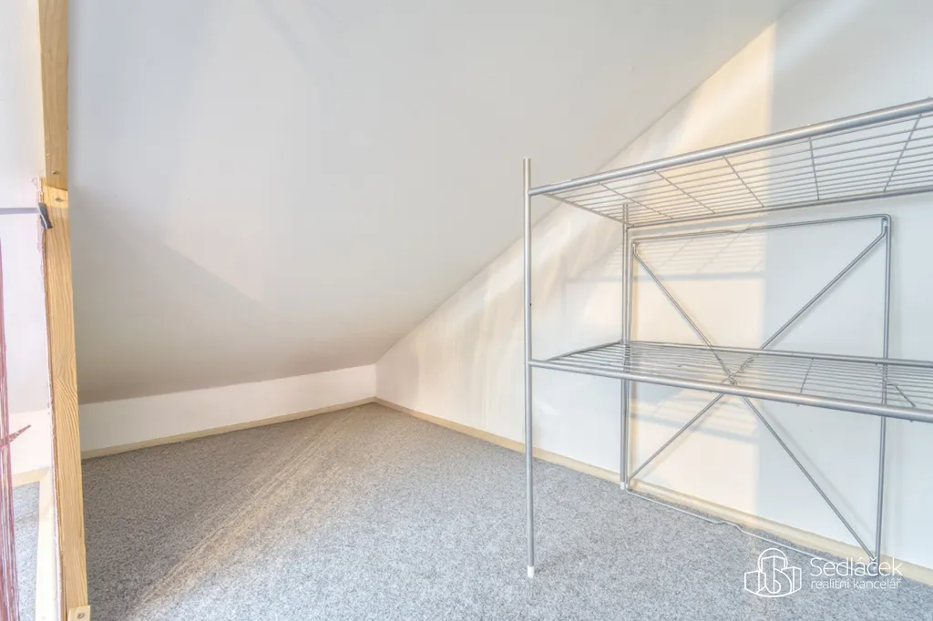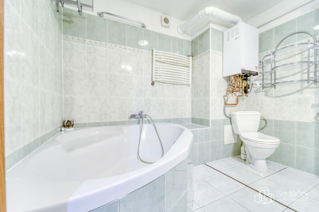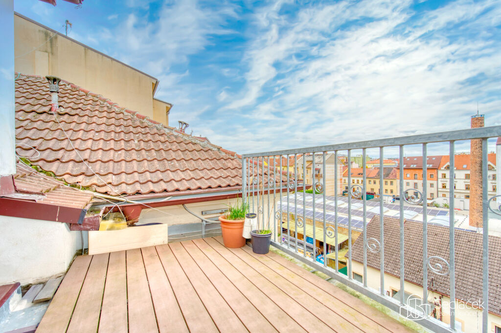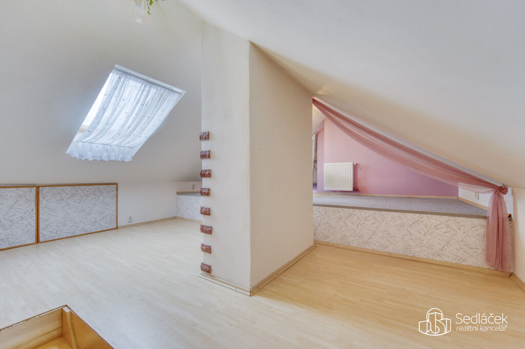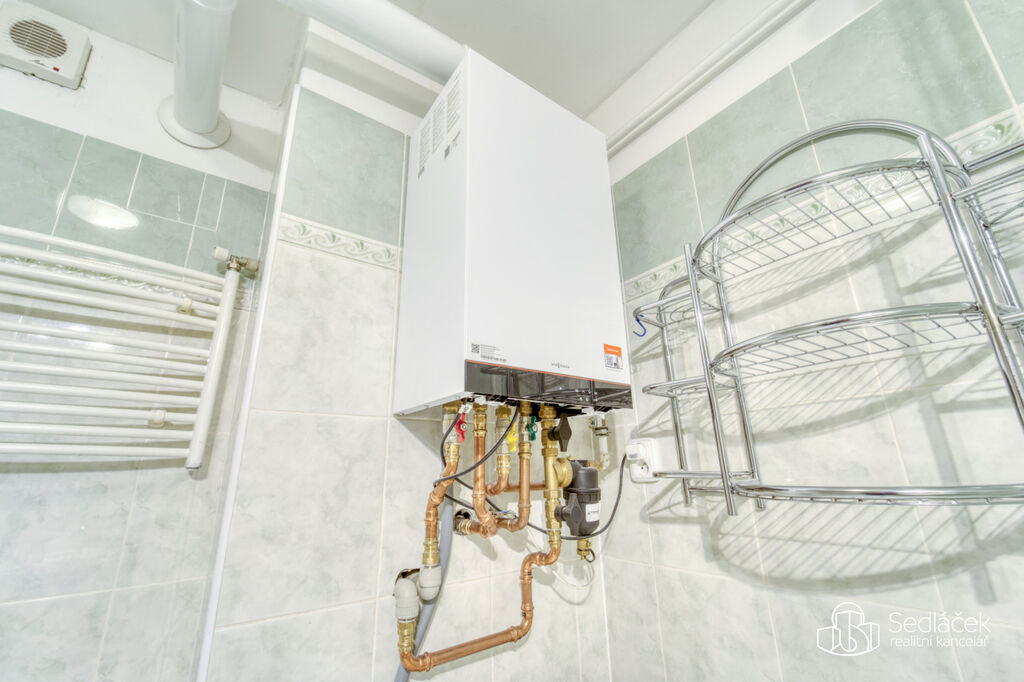 Byt se nachází ve velmi dobrém stavu a zaujme členitým dispozičním řešením. V hlavní obytné části se nachází prostorná kuchyně s jídelním koutem, odkud je vstup na terasou s výhledem na město. Dřevěné trámy dodávají interiéru příjemnou atmosféru. Koupelna nabízí vanu i sprchový kout, vytápění zajišťuje nový kondenzační plynový kotel. Dále jsou zde dva samostatné pokoje a komora.