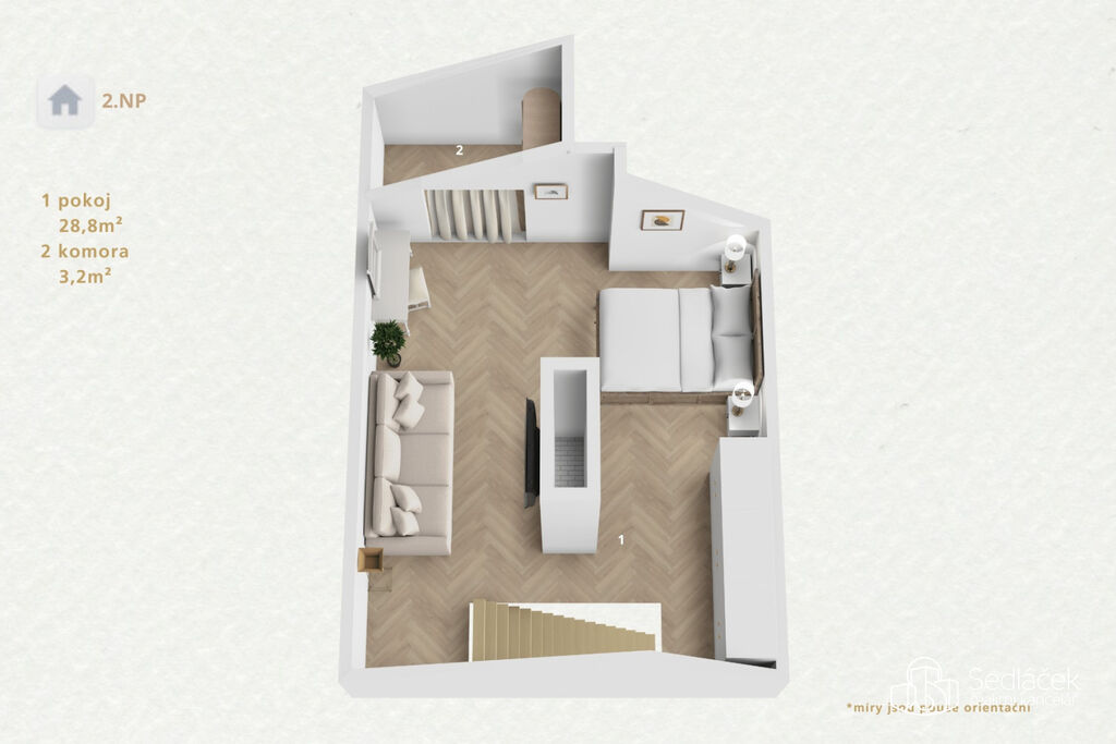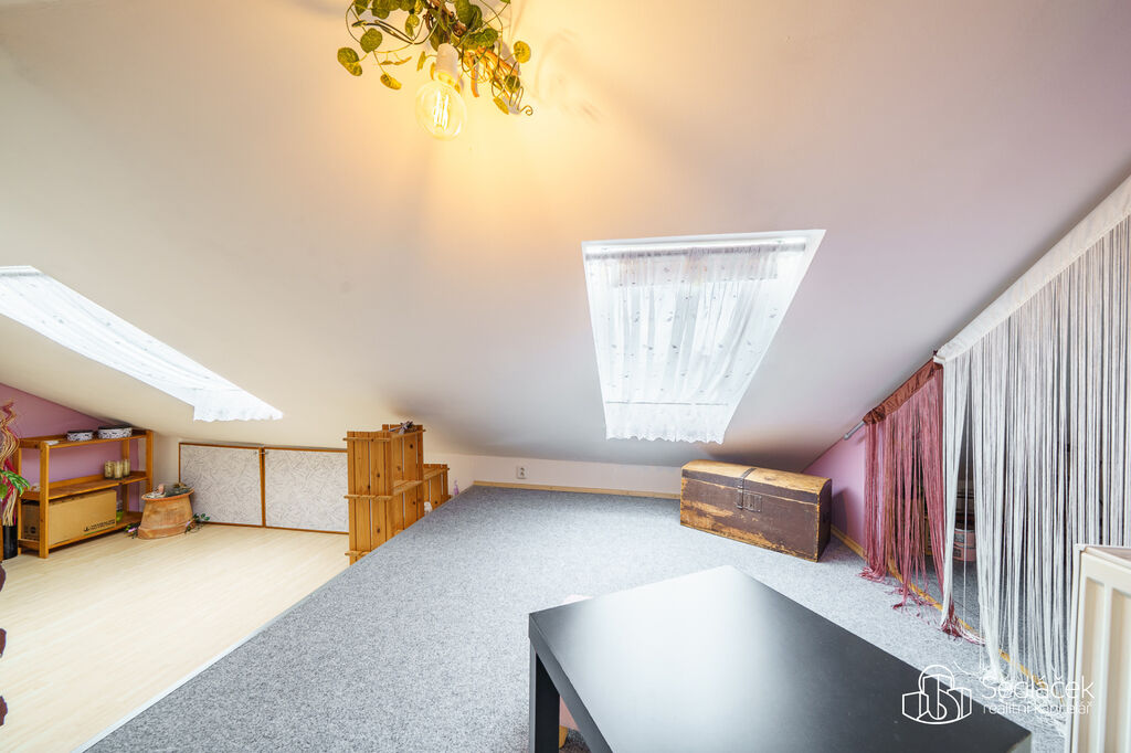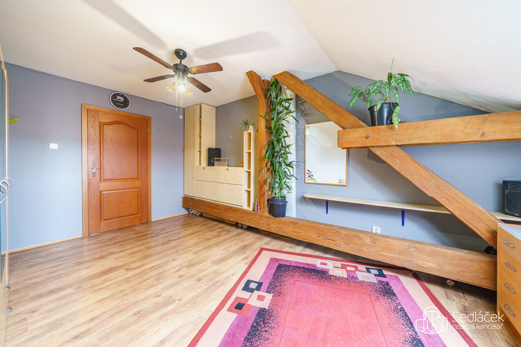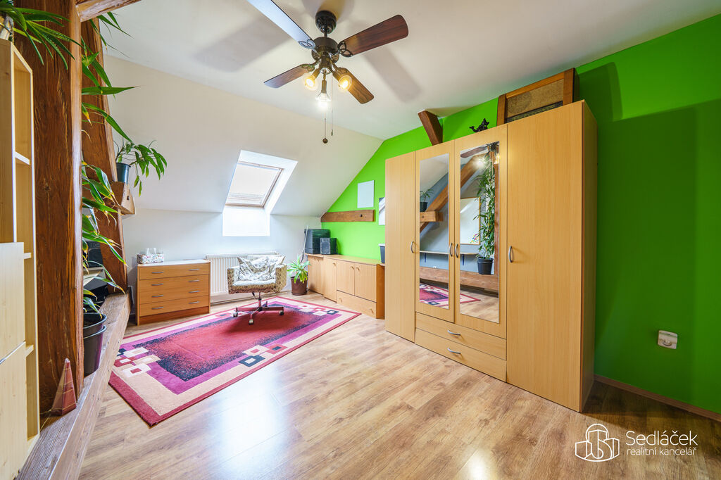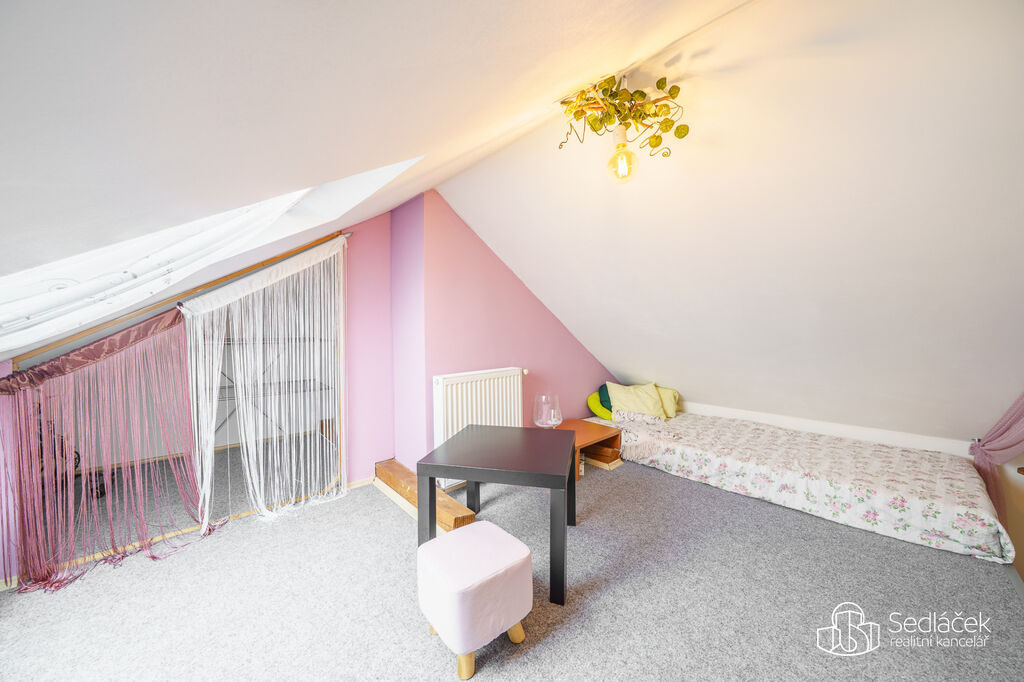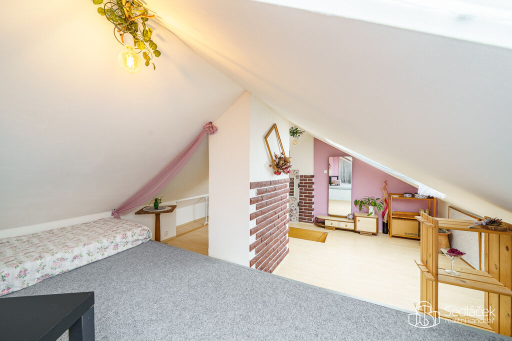 Po dřevěném schodišti se vchází do podkrovního patra s pokojem a šatnou – ideální jako ložnice nebo dětský pokoj.