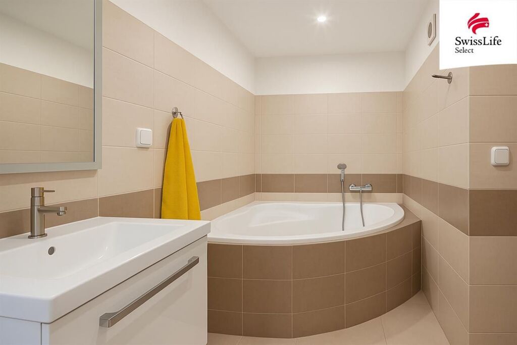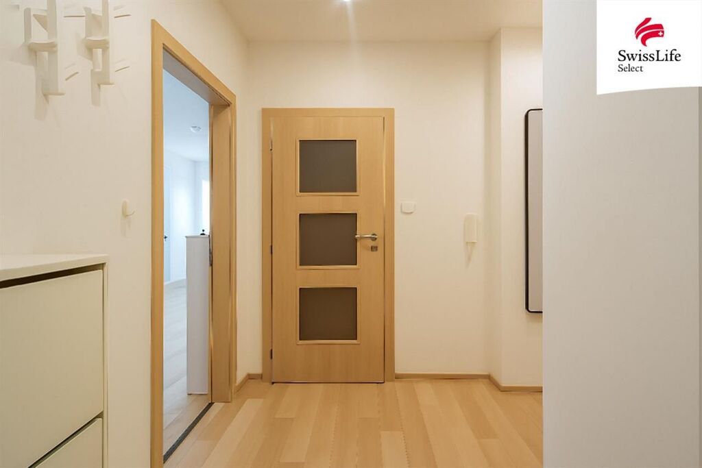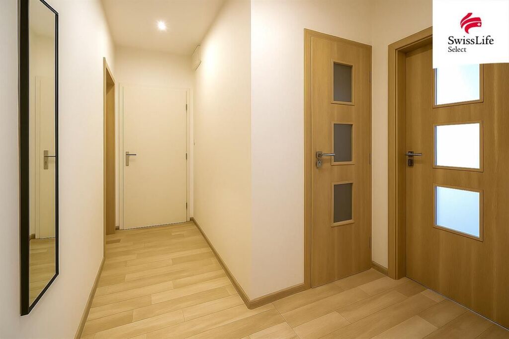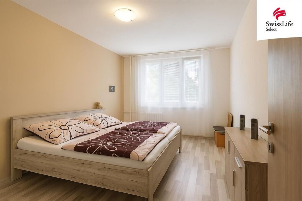 Dispozice bytu zahrnuje velkou ložnici, světlý obývací pokoj, kuchyni s moderní linkou a vestavnými spotřebiči, prostornou koupelnu s rohovou vanou, samostatné WC a praktickou šatnu s dostatkem úložného prostoru. Kuchyně je propojena s obývacím pokojem, který navazuje na předsíň díky tomu působí celý byt vzdušně a funkčně. K dispozici nájemci zůstane lednice, gauč, obývací stěna a skříň.