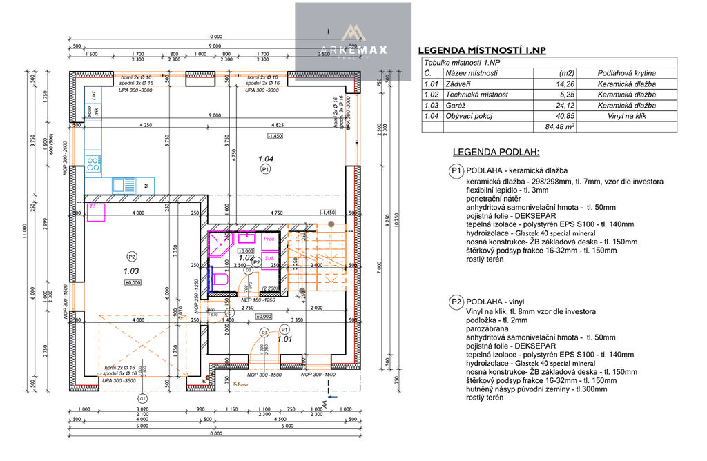 Po celé ploše domu je podlahové vytápění napojeno na úsporné teplené čerpadlo, primární zdroj tepla a zásobník (180-200l) na ohřev teplé vody. Tento zdroj je umístěn v garáži v 1NP. Energetickou náročnost budovy ve skupině A zajišťuje kvalitní izolace tloušťky 200 mm a plastová okna s trojsklem, s venkovními el. ovládanými žaluziemi. Vjezd do garáže přes sekční el. ovládaná vrata. Před domem bude venkovní jednotka tepelného čerpadla. Venkovní terasa – kompozitní prkna.