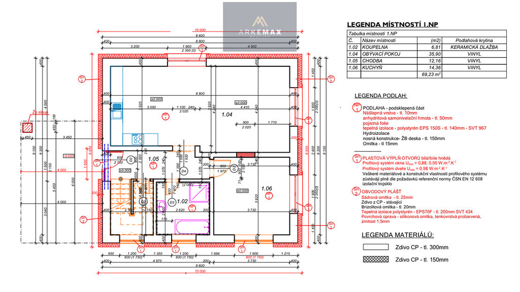 Dům je postaven z cihlových tvárnic a kompletně zateplený. Střecha sedlová s plechovou krytinou. Okna jsou plastová 5-tipolohová, 6-ti komorová s izolačním trojsklem. Objekt bude vytápěn pomocí tepelného čerpadla a jako otopné medium bude voda v podlahovém rozvodu. Odpad je řešen kanalizací.