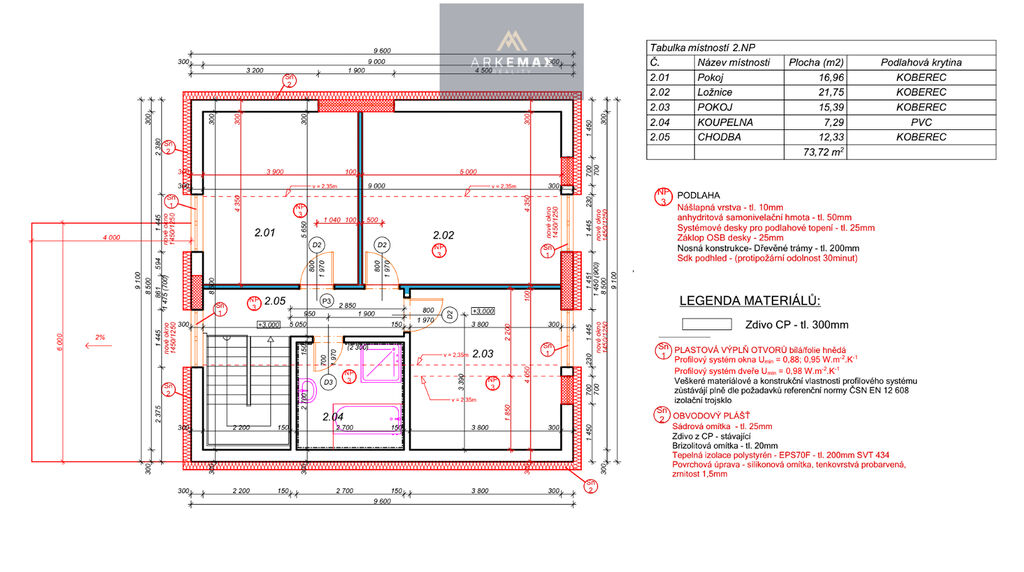 Pokud se vydáte nahoru do patra, čeká na vás chodba, ze které se dostanete do ložnice o výměře 22 m2, kde se bude pohodlně spát. Dále jsou zde dva pokoje o velikosti 17 m2 a 16 m2, místa je tu dost na relaxování i studium. V patře je druhá koupelna s vanou a WC.