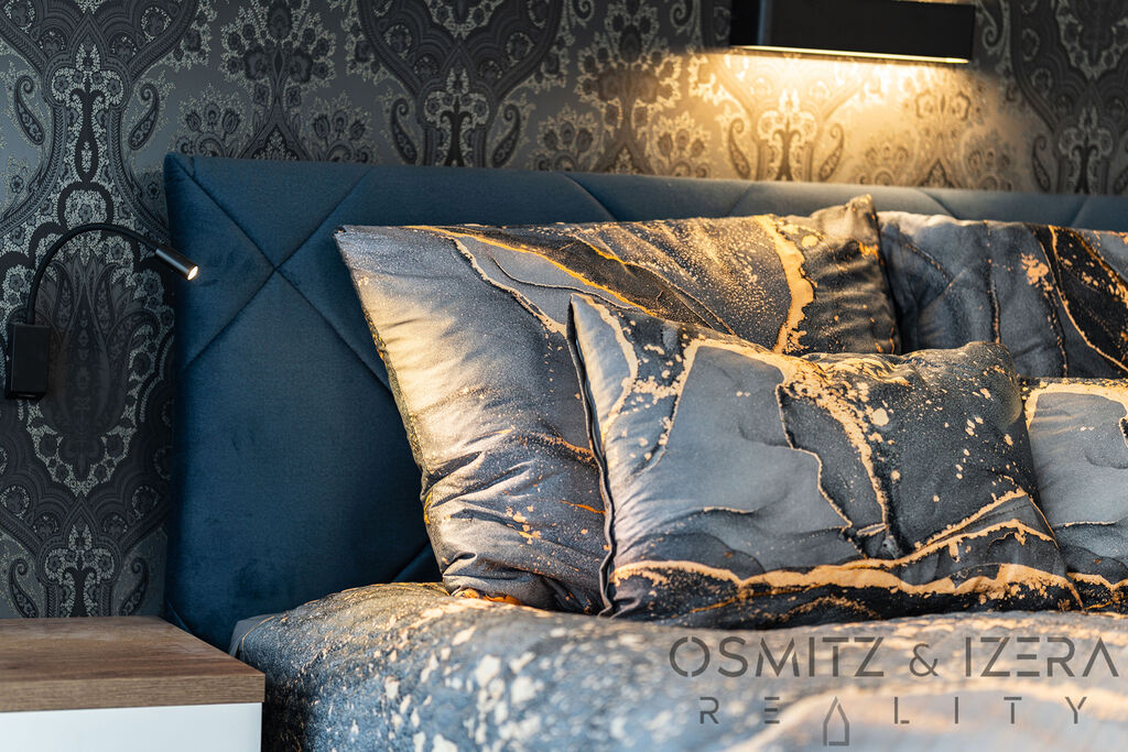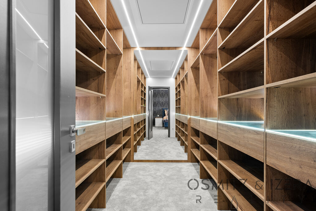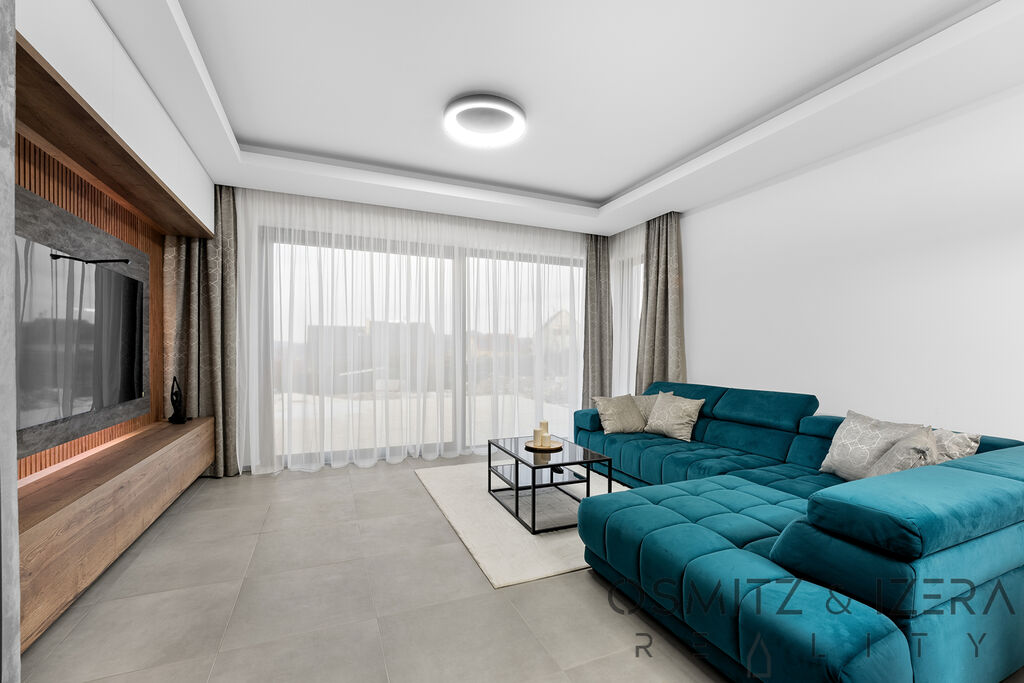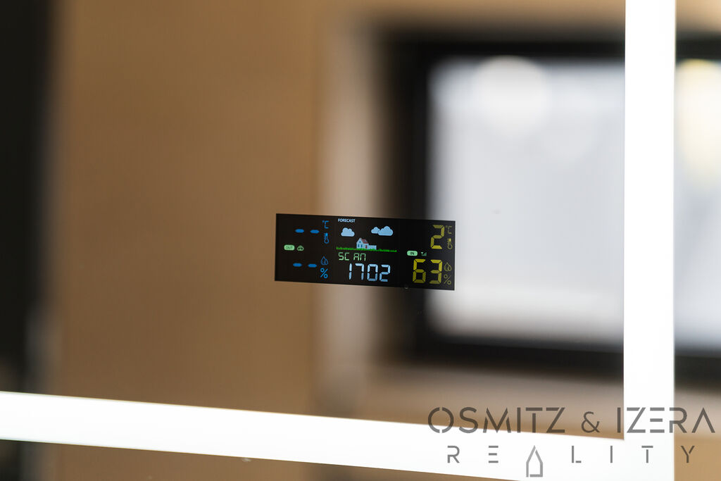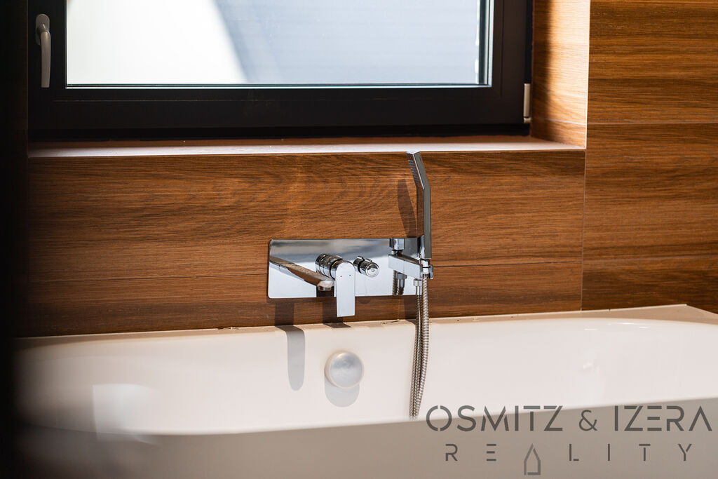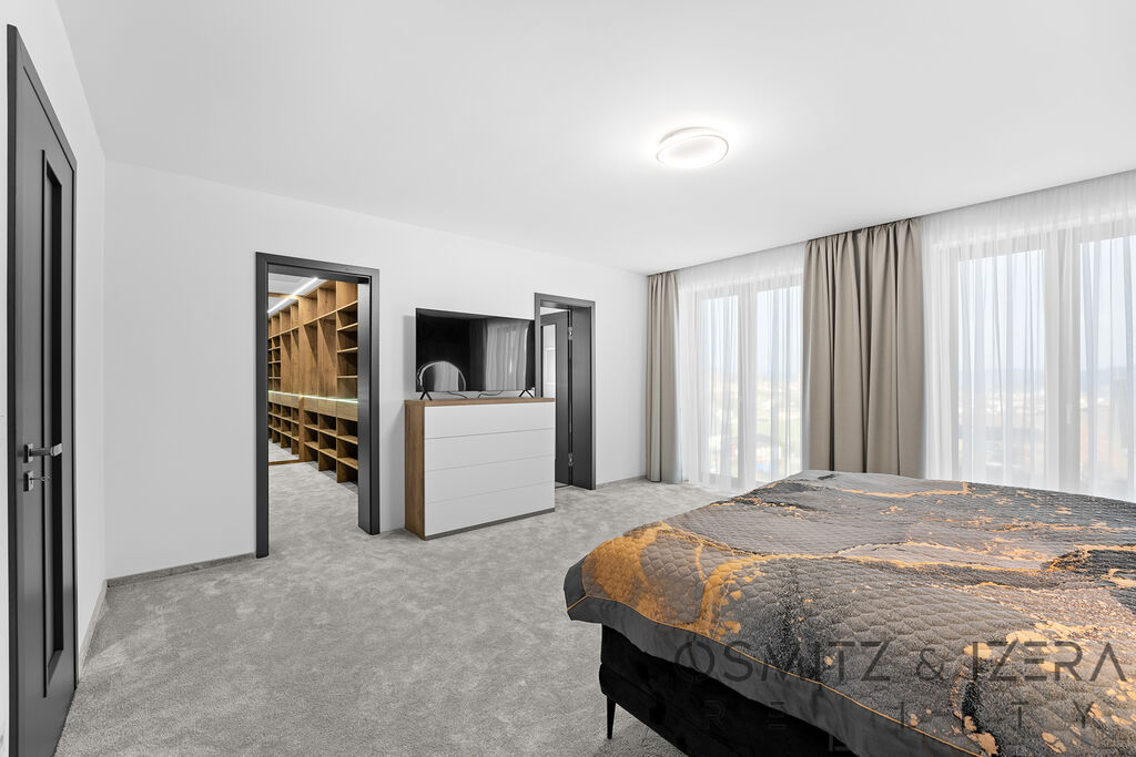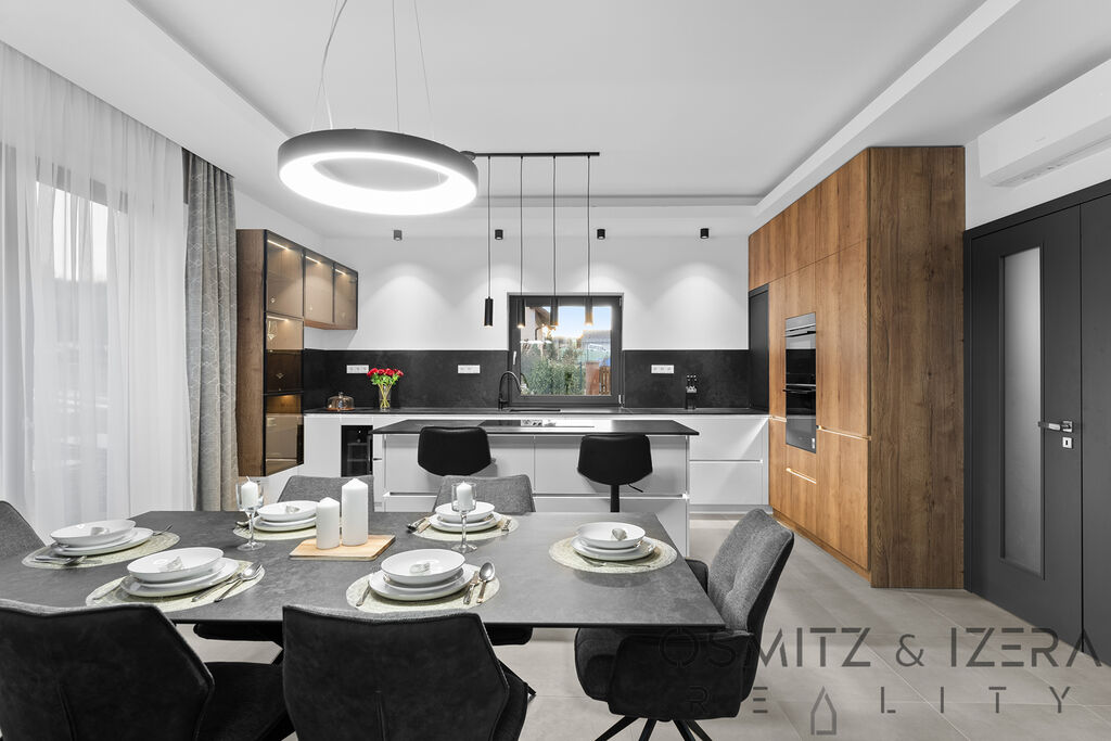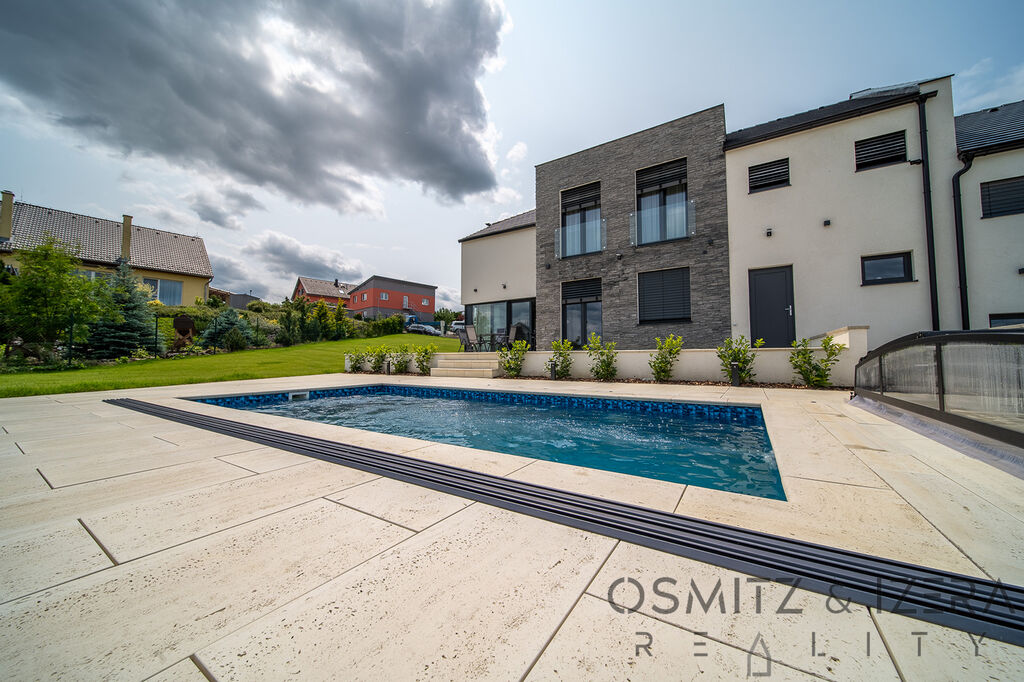 V přízemí domu se nachází prostorný obývací pokoj s kuchyňským koutem, který je ideální pro rodinné setkání a společenské akce. Zde umístěná luxusní kuchyňská linka se spotřebiči značky Siemens nadchne všechny milovníky vaření. K dispozici je také wellness zóna, která zahrnuje vířivku a saunu, což přispívá k relaxaci a odpočinku po náročném dni. Přes velkoformátová francouzská okna je možné vstoupit přímo na stupňovitě sestupující venkovní terasu s krytým bazénem.
