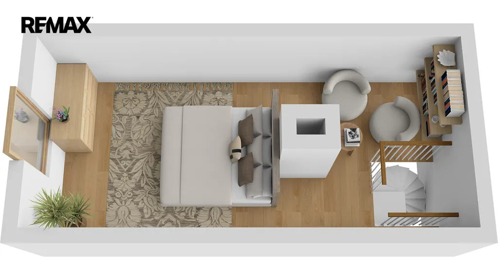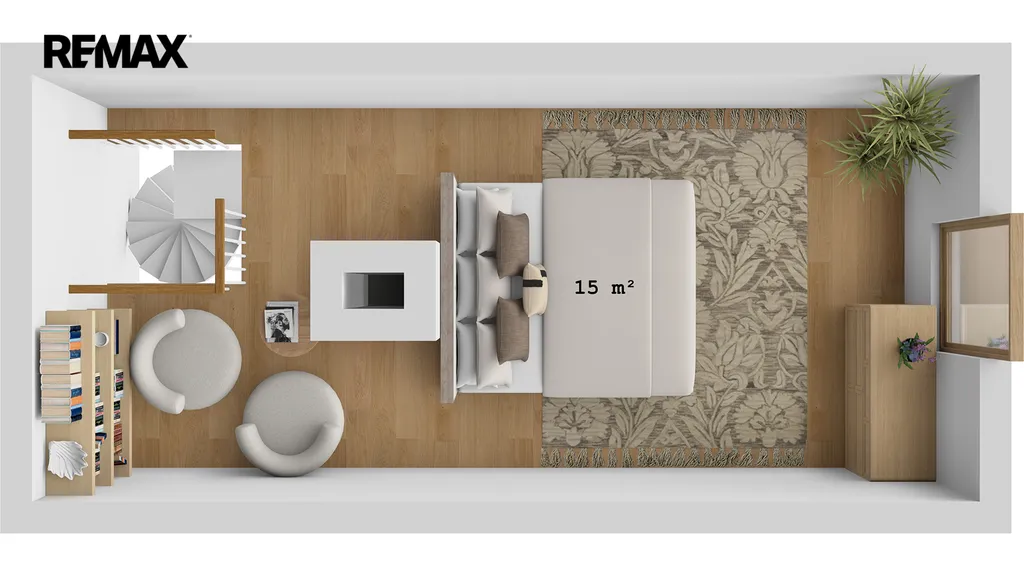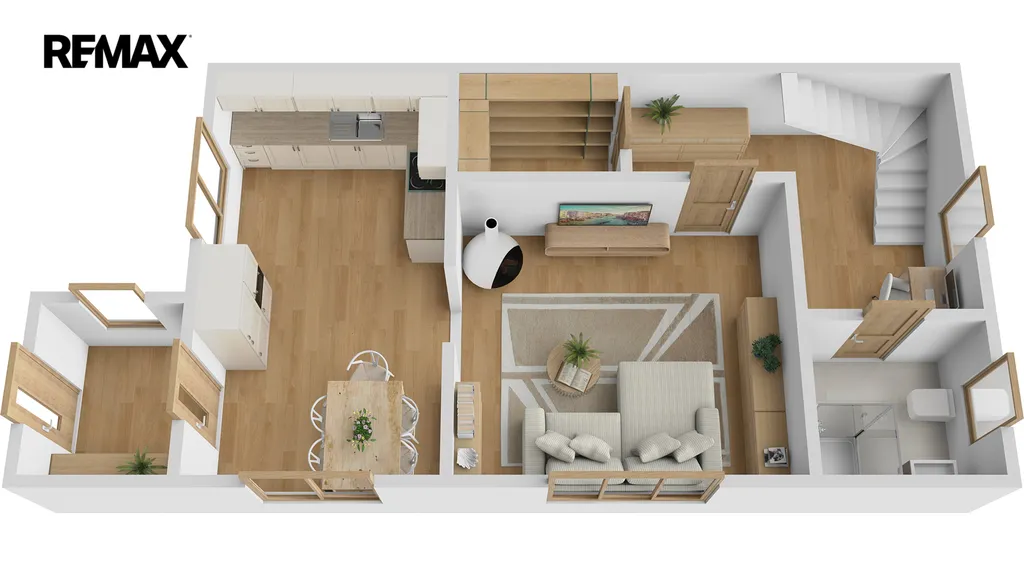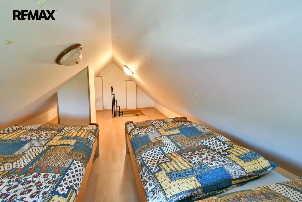 V přízemí se nachází předsíň, jídelna s kuchyňským koutem, obývací pokoj, technická místnost, chodba s úložným prostorem v mezipatře a koupelna s WC. Do 1. patra vede dřevěné schodiště, kde najdete prostornou ložnici s dvěma oddělenými prostorami a vstup na menší terasu. Další schodiště vede do sníženého podkroví, které slouží jako druhá ložnice.