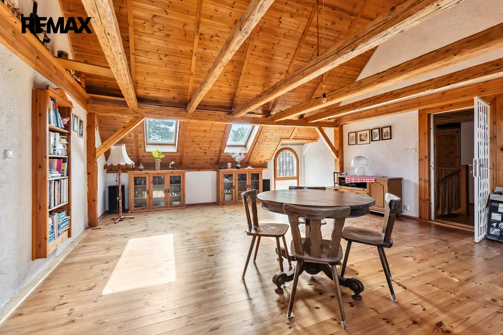 V prvním patře se nachází dvě útulné ložnice, kuchyň, koupelna a velkorysá místnost o ploše 38 m², která se perfektně hodí jako rodinná jídelna, ateliér, herna nebo třeba prostor pro podnikání.