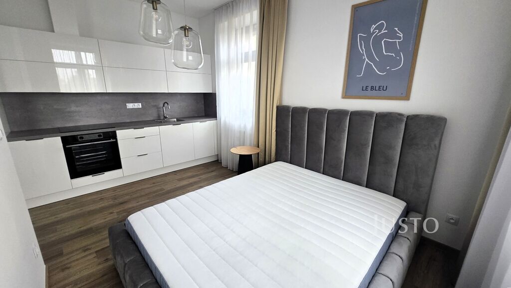 Vybavení bytu, sedací souprava, postel, šatní skříň, konferenční stolek, televizní set. Díky vybavení a dispozici je ideální pro jednotlivce, kteří hledají komfortní a moderní bydlení bez nutnosti dalších investic.