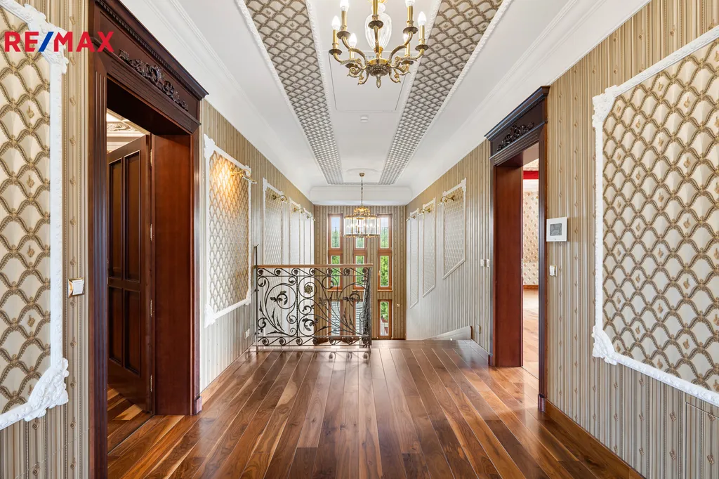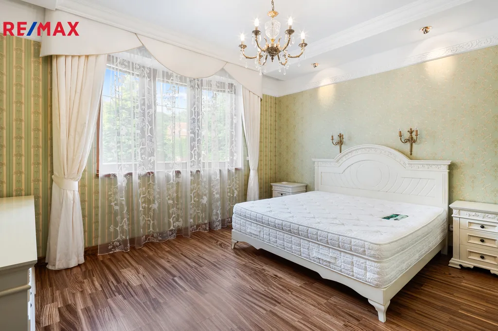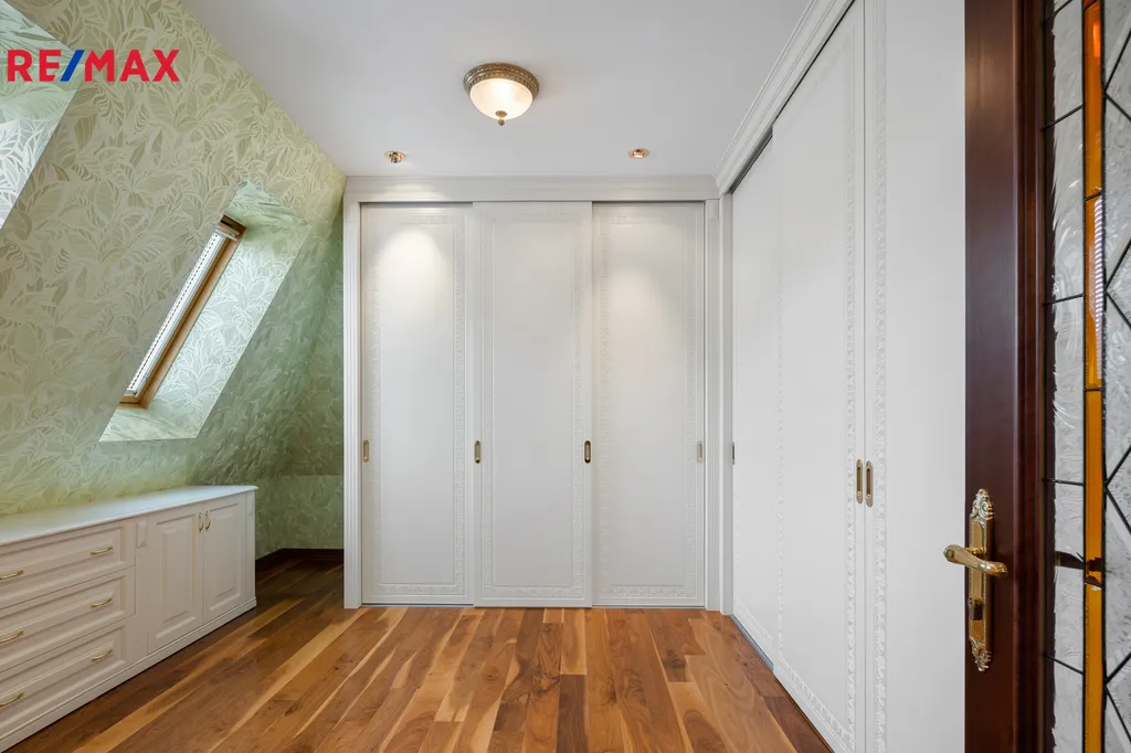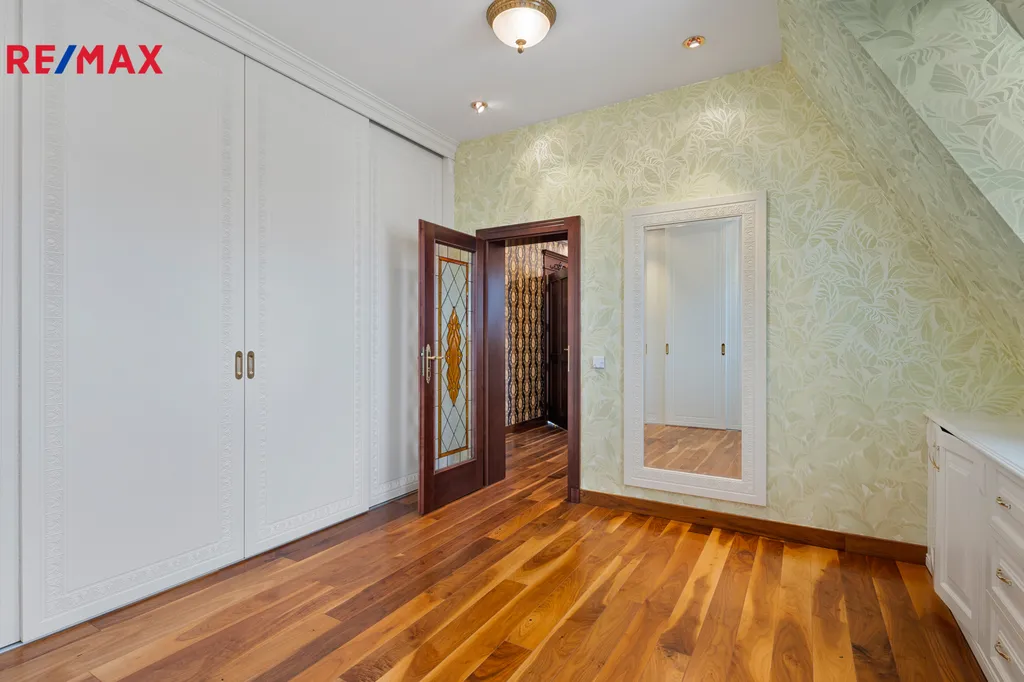V patře se nachází další elegantní ložnice s balkonem a vlastní koupelnou, pracovna a prostorná šatna – vše s důrazem na komfort a vkus.