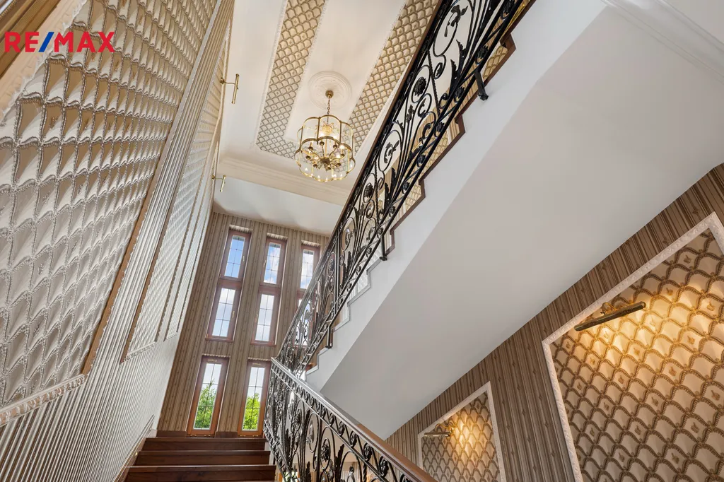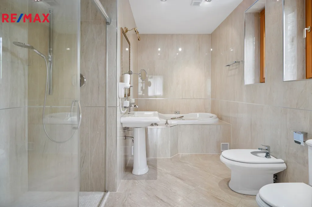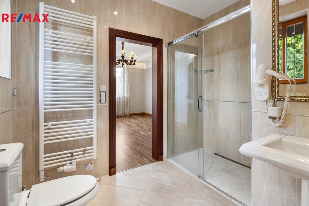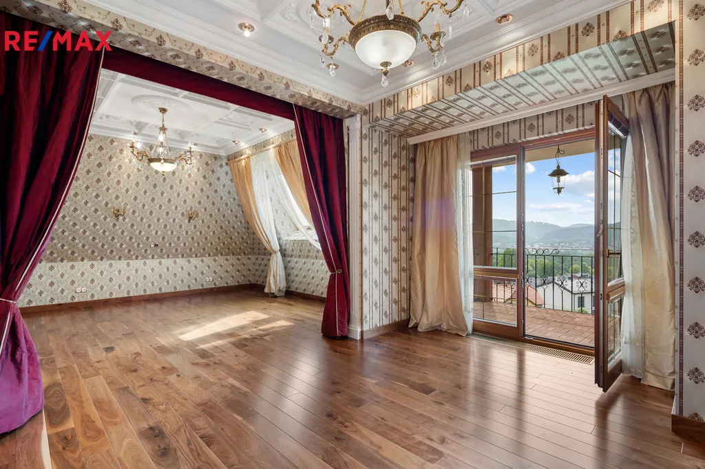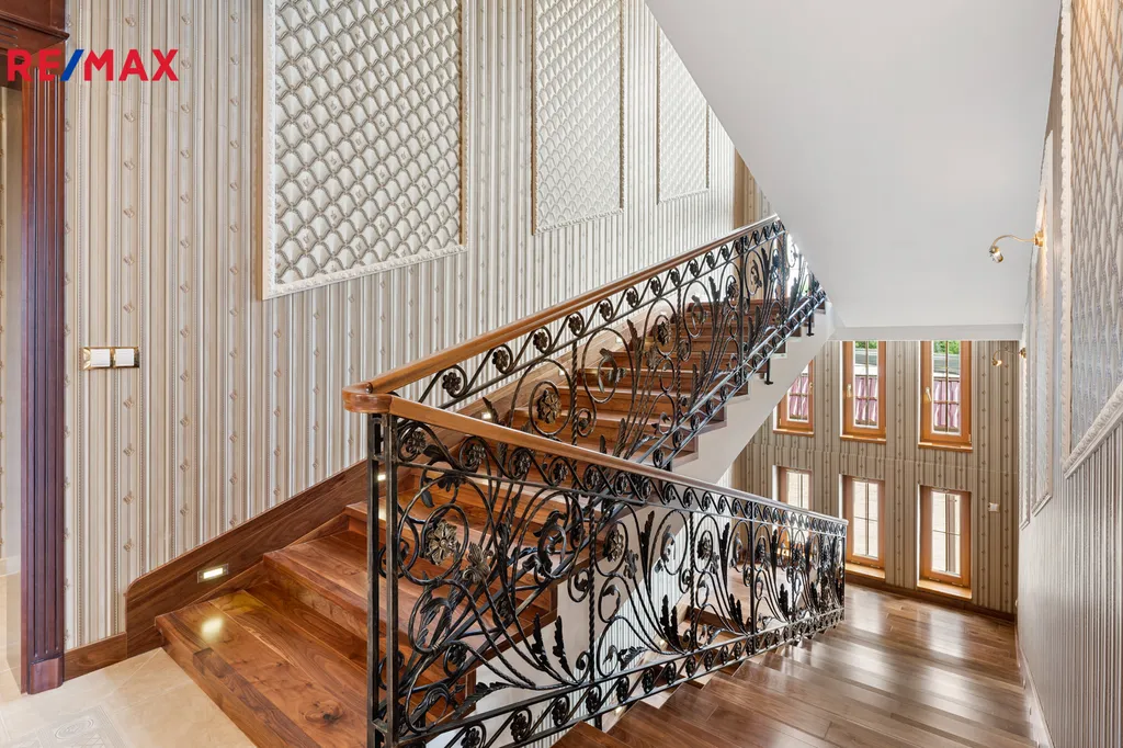 V patře se nachází další elegantní ložnice s balkonem a vlastní koupelnou, pracovna a prostorná šatna – vše s důrazem na komfort a vkus.