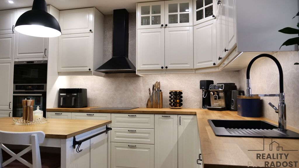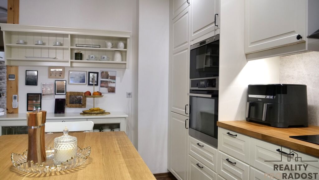 Dům je součástí řadové zástavby, je patrový, částečně podsklepený a disponuje vlastní garáží. Ze zádveří vstoupíte do vstupní haly se schodištěm, odkud se pohodlně dostanete do všech částí přízemí. Nachází se zde koupelna se sprchovým koutem a toaletou, technická místnost, ložnice a hlavní obytný prostor – vkusně propojený obývací pokoj s litinovými krbovými kamny a kuchyňským koutem. Kuchyňská linka byla instalována před dvěma a půl lety, je moderní, vyrobená na míru a vybavená kvalitními spotřebiči.
