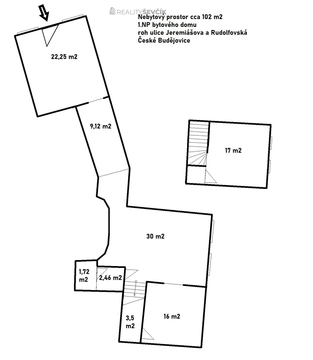 Nabízíme k pronájmu nebytový prostor o výměře 102 m² v atraktivní a frekventované lokalitě širšího centra Českých Budějovic. Prostor se nachází na rohové pozici ulic Jeremiášova a Rudolfovská, s výlohou a přímým vstupem z ulice Rudolfovská.