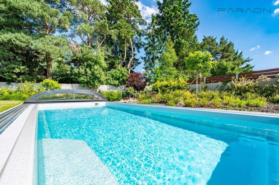 Prodej moderní pasivní a vzdušné novostavby (A) z roku 2021 vytápěné tepelným čerpadlem, včetně vyhřívání zastřešeného bazénu (7,2 x 3,4 m) se slanou vodou a protiproudem, splňuje veškeré nároky na bydlení vyššího standardu v přírodě s nízkými provozními náklady, a to v luxusním jednopodlažním domě s rekuperací vzduchu. Dům nabízí vzdušný a slunný interiér na krásném, rovinatém a slunném pozemku o velikosti 1 132 m v klidné rezidenční části obce Mukařov Srbín nedaleko Říčan, pouhých 20 km od Prahy. Pozemek zahrnuje upravenou zahradu s automatickým zavlažováním. Pozemek zahrnuje upravenou zahradu s automatickým zavlažováním a designový zahradní domek se sociálním zařízením (koupelna, toaleta), samostatným pokojem a technickou místností (sklad), vše lemováno vzrostlou zelení, zděným plotem a hliníkovými lamelami, které zajišťují maximální nerušené soukromí a zároveň pocit intimity a ničím nerušeného klidu.