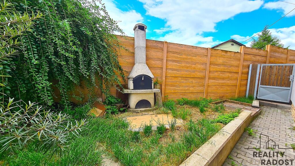 Zahrada má ideální velikost pro venkovní aktivity. Nachází se  na ni zahradní krb a zahradní domeček využívaný jako sklad nářadí. Dvůr za domem je vydlážděný a z velké části krytý pergolou s posezením. Celý pozemek je oplocený. Před vchodem do domu je dlážděná parkovací plocha pro 2 auta s vjezdem a bránou na dálkové ovládání.