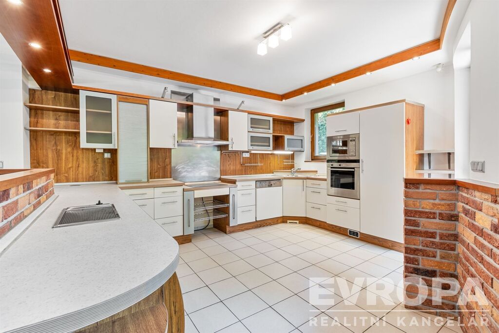 Dům je řešen jako 6+1, což umožňuje komfortní bydlení i pro početnější rodiny. Velkorysý obývací pokoj je spojený s prostornou kuchyní a jídelnou. Velká okna a francouzské dveře zajišťují dostatek denního světla a přímý přístup na terasu a do zahrady z pokoje i z kuchyně. V přízemí je dále pokoj pro hosty, koupelna s WC, šatna, prádelna, posilovna s výstupem na zahradu, finská sauna a herna. Ve druhém nadzemním podlaží jsou čtyři pokoje, samostatné WC, prostorná atypická koupelna s vanou, sprchou a dvěma umývadly, šatna.
