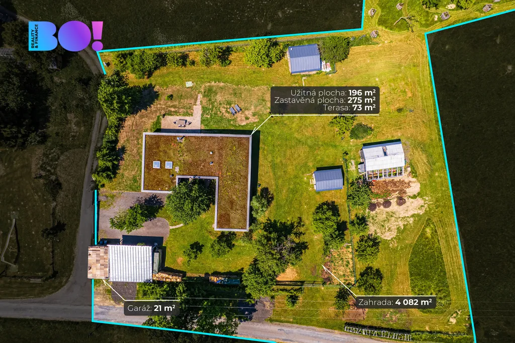 Rodinný dům o dispozici 6+kk je situován na rozsáhlém pozemku 6 428 m² s udržovanou zahradou, samostatnou garáží, dvěma zahradními domky a letní kuchyní. Samotná zastavěná plocha domu činí 275 m², navíc je k dispozici prostorná terasa o výměře 72 m² orientovaná na západ.