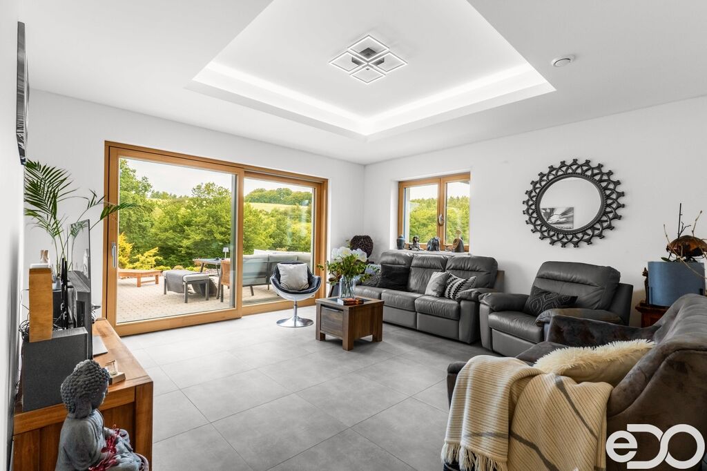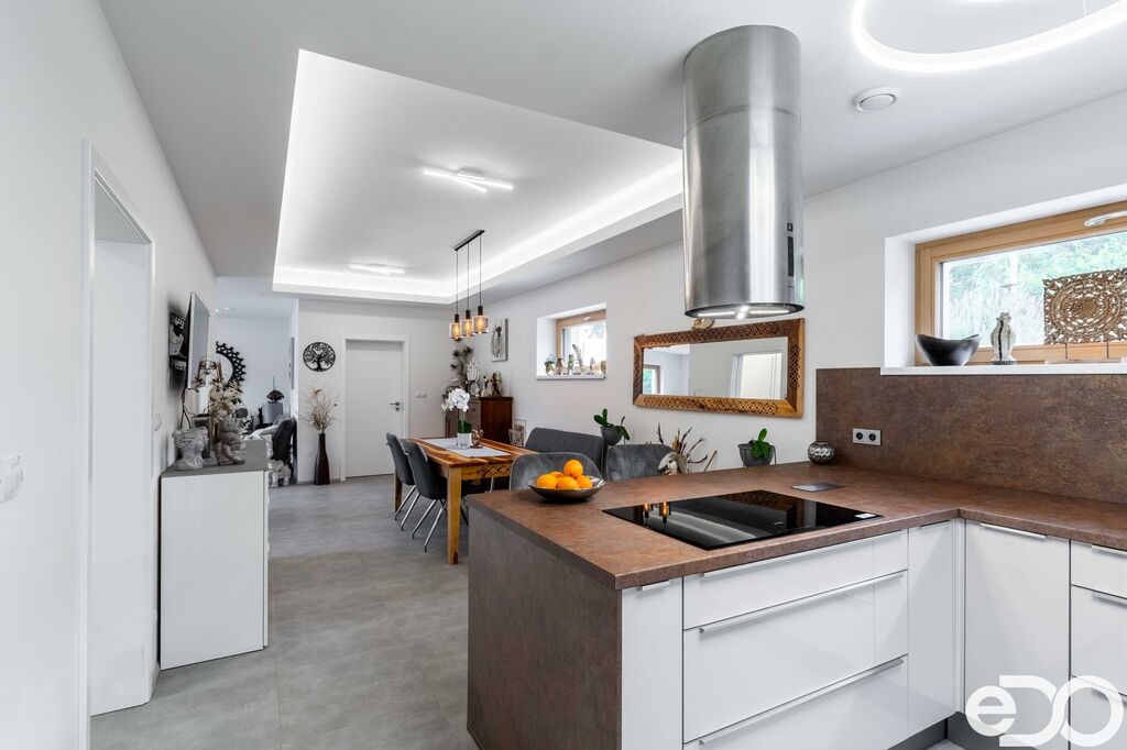 Dům je nízkoenergetický, vytápěný tepelným čerpadlem, s podlahovým topením, rekuperací a elektrickými roletami. Dispozice nabídne prostorný obývací pokoj s výstupem na terasu s krásným výhledem, kuchyňský kout, ložnici, tři další pokoje, koupelnu i technické zázemí. Zahrada má dost místa na bazén, pěstování i rodinné aktivity.