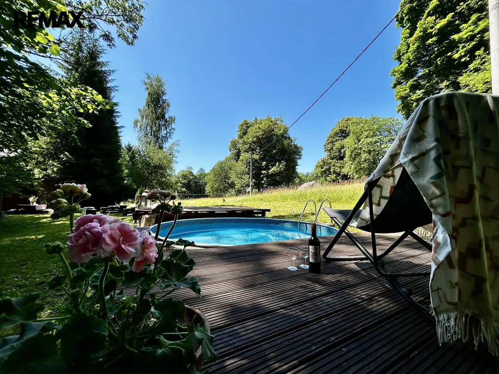 Součástí chalupy je i bazén o ploše 6 m², který příjemně osvěží v horkých letních dnech. Co se týče technického zázemí, odpad je řešen trativodem, přičemž přívod vody zajišťuje vrtaná studna 35 m hluboká, což je další výhodou pro ekologické hospodaření. Chalupa je vytápěna pomocí elektrokotle, radiátorů a krbových kamen, přičemž teplou vodu zajišťuje elektrický bojler.