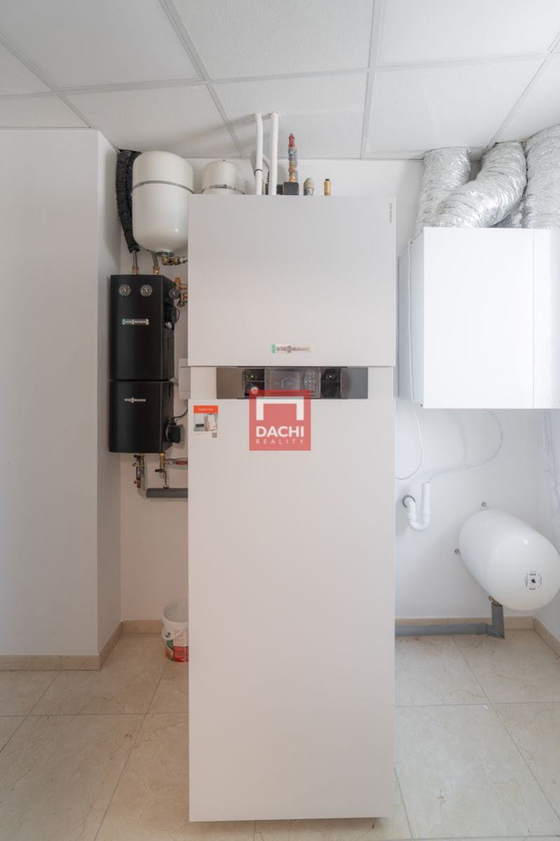 Technická místnost s přípojkami na pračku a sušičku, kde jsou umístěny moderní technologie: tepelné čerpadlo Vitocal 222S, solární termický systém Vitosol 300 TM a vzduchotechnická jednotka Vitovent 300W