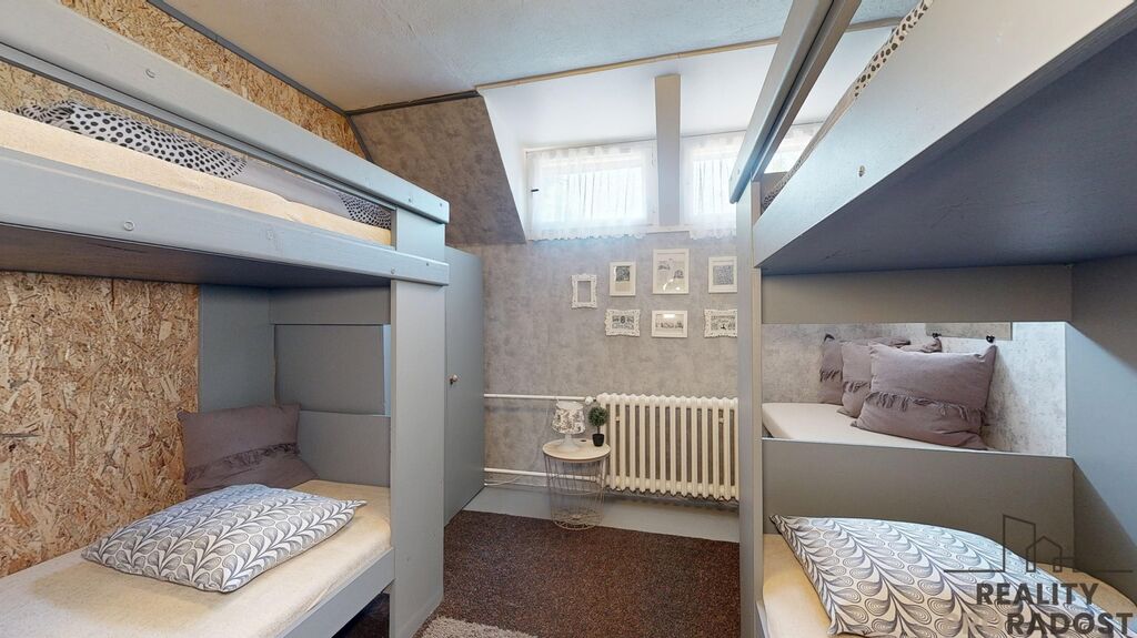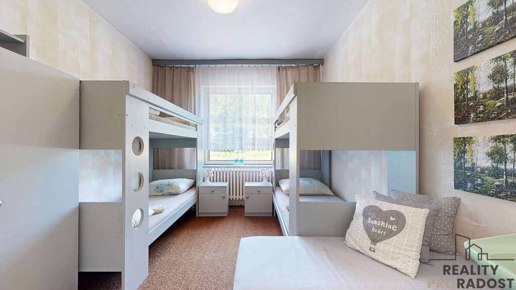 Součástí areálu je rozlehlá hlavní budova zkolaudovaná v roce 1989, doposud využívaná převážně v letní sezoně. Nabízí deset pokojů, několik koupelen, společenský sál, restauraci/jídelnu, velkou kuchyň a technické zázemí. Temperování zajišťuje automatický kotel, ohřev vody tři bojlery. Objekt je určen primárně pro sezónní provoz, ale potenciál je jednoznačně celoroční – buď kompletní rekonstrukcí dle vlastního stylu, nebo vytvořením zcela nového architektonického konceptu. Lokalita i pozemek doslova vybízí k vybudování moderního rekreačního zařízení, glamping resortu, penzionu, školícího centra nebo soukromého retreatu. Energetický štítek není k dispozici, je to stará chata určená k letní rekreaci – v inzerci, uvádíme třídu G.