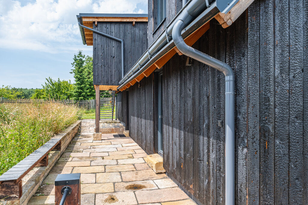 Okolí domu je vkusně upraveno ve stejném duchu a nabízí příjemné zákoutí pro relaxaci.