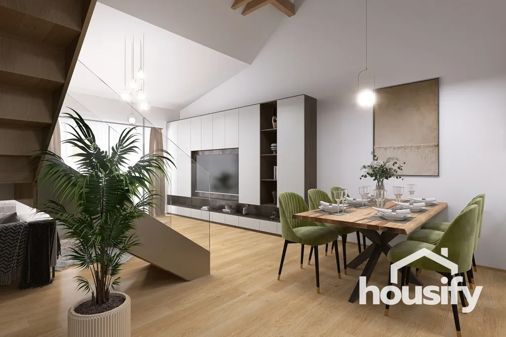 Hlavní obytná část o rozloze 64 m² spojuje otevřený mezonet, obývací pokoj a kuchyňský kout. Výjimečnou atmosféru tohoto prostoru vytváří kombinace minimalistických detailů, industriálního kovového schodiště a hřejivosti přírodních materiálů, jako jsou dřevěné trámy. Pečlivé propojení těchto prvků dodává interiéru nezaměnitelný charakter. Další komfort zajistí tři samostatné ložnice a dvě koupelny s toaletou.