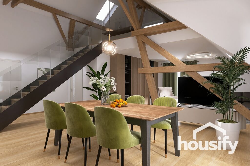 Hlavní obytná část o rozloze 77 m² spojuje otevřený mezonet, obývací pokoj a kuchyňský kout. Výjimečnou atmosféru tohoto prostoru vytváří kombinace minimalistických detailů, industriálního kovového schodiště a hřejivosti přírodních materiálů, jako jsou dřevěné trámy. Pečlivé propojení těchto prvků dodává interiéru nezaměnitelný charakter. Další komfort zajistí tři samostatné ložnice a dvě koupelny s toaletou.