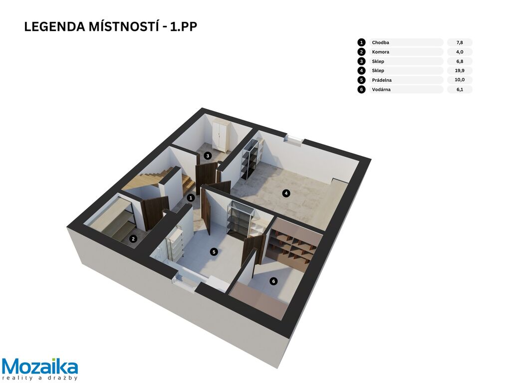 • Přízemí: vstupní chodba, kuchyně, obývací pokoj, WC
