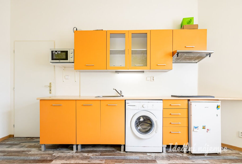 Ta je zařízena lednicí, pračkou, varnou deskou a digestoří. V bytě je také rozkládací pohovka.