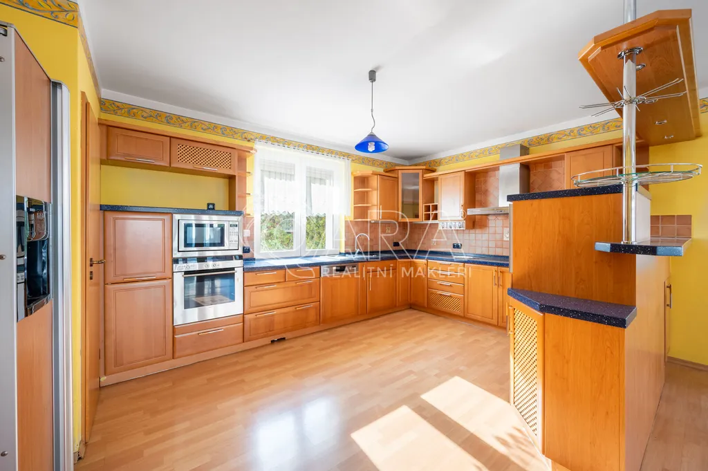 Tento cihlový dům s podlahovou plochou 435 m² byl postaven z kvalitních materiálů v roce 2002 jako promyšlené rodinné sídlo, kde je dostatek místa pro každého člena rodiny i hosty. Prakticky řešené propojení vnitřních i venkovních prostor nabízí naprosté soukromí i dokonalé zázemí pro setkávání, ať už v obývacím pokoji u rodinného krbu, v kuchyni s jídelnou a zimní zahradou, nebo na slunné terase s markýzou, která navazuje na krytý bazén.