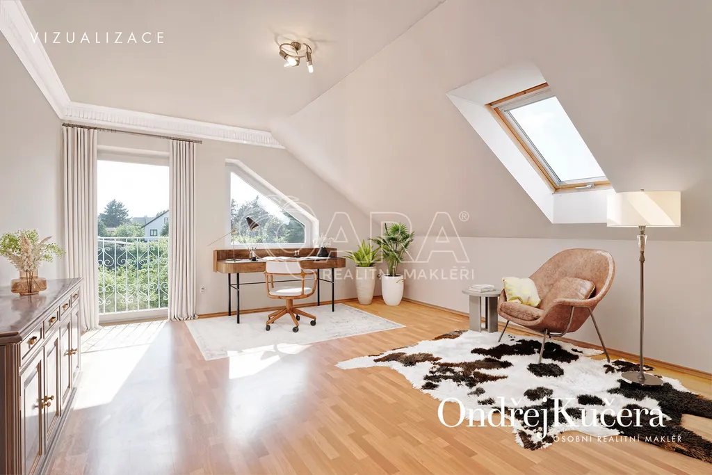 - Chytré členění: klidová zóna s ložnicemi, pracovnou, pokojem pro hosty či fitness je umístěna v patře. Hlavní ložnice má vlastní šatnu, koupelnu a balkon.