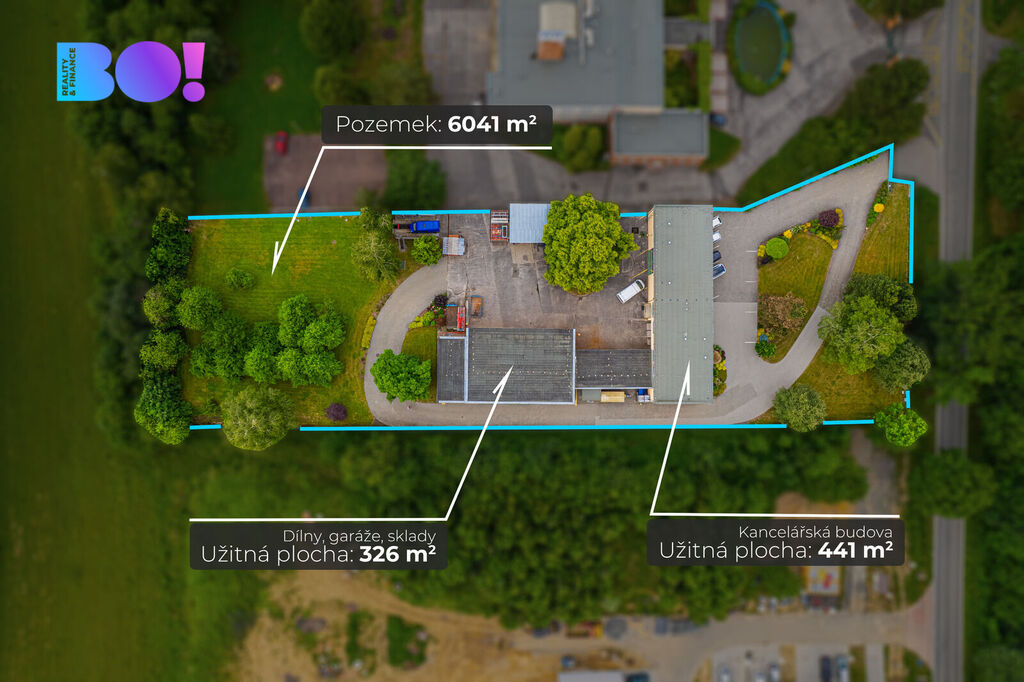 Areál se nachází na oploceném pozemku o rozloze 6 041 m² a nabízí široké možnosti využití. Kancelářské prostory, skladování až po výrobu či obchodní činnost.