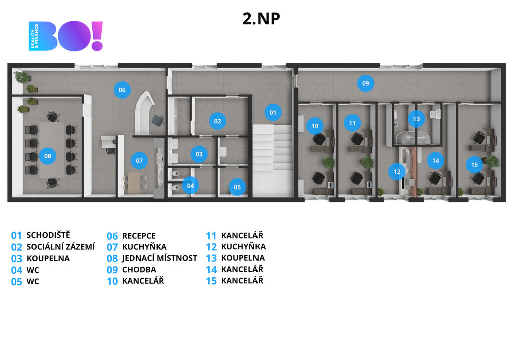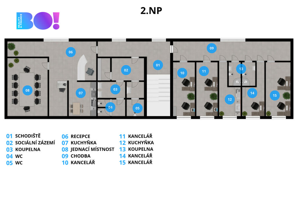 • Prostor pro Vaše nápady: Dvoupatrová cihlová budova nabízí 10 světlých kanceláří, 5 koupelen a 6 samostatných toalet – maximální komfort a pohodlí pro Vás i Váš tým.