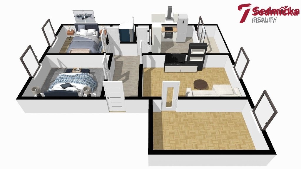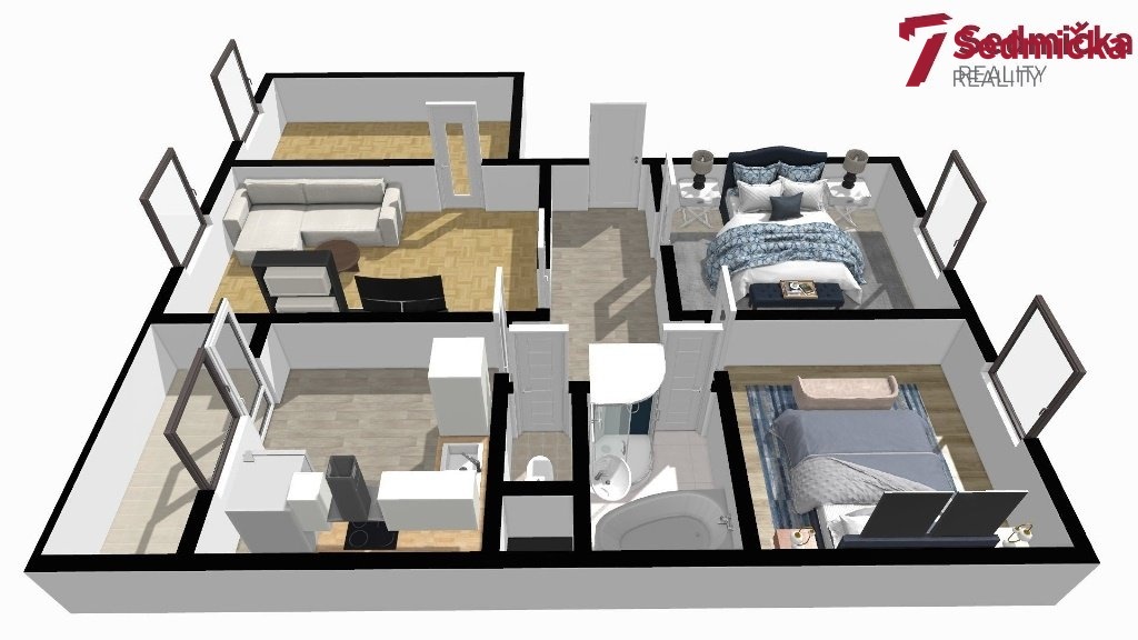 kuchyně 11 m2, 1. pokoj 18 m2, 2. pokoj 12 m2, 3. pokoj 13 m2, 4. pokoj 13 m2, chodba 9 m2, koupelna 4,7 m2, WC 1,3 m2 a lodžie 3 m2.
