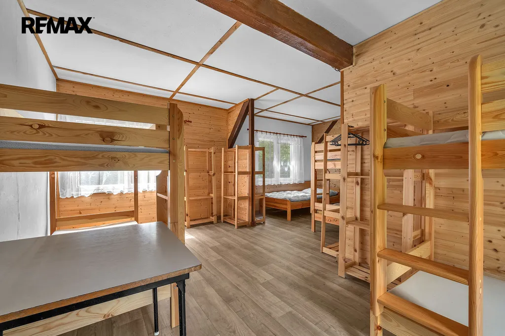 V hlavní budově je čtyřlůžková ložnice, průchozí ložnice pro 6 osob a 3× ložnice se 16 lůžky, plně vybavená kuchyň a jídelna,která se dá využít i jako společenská místnost, herna, sprchy a WC.